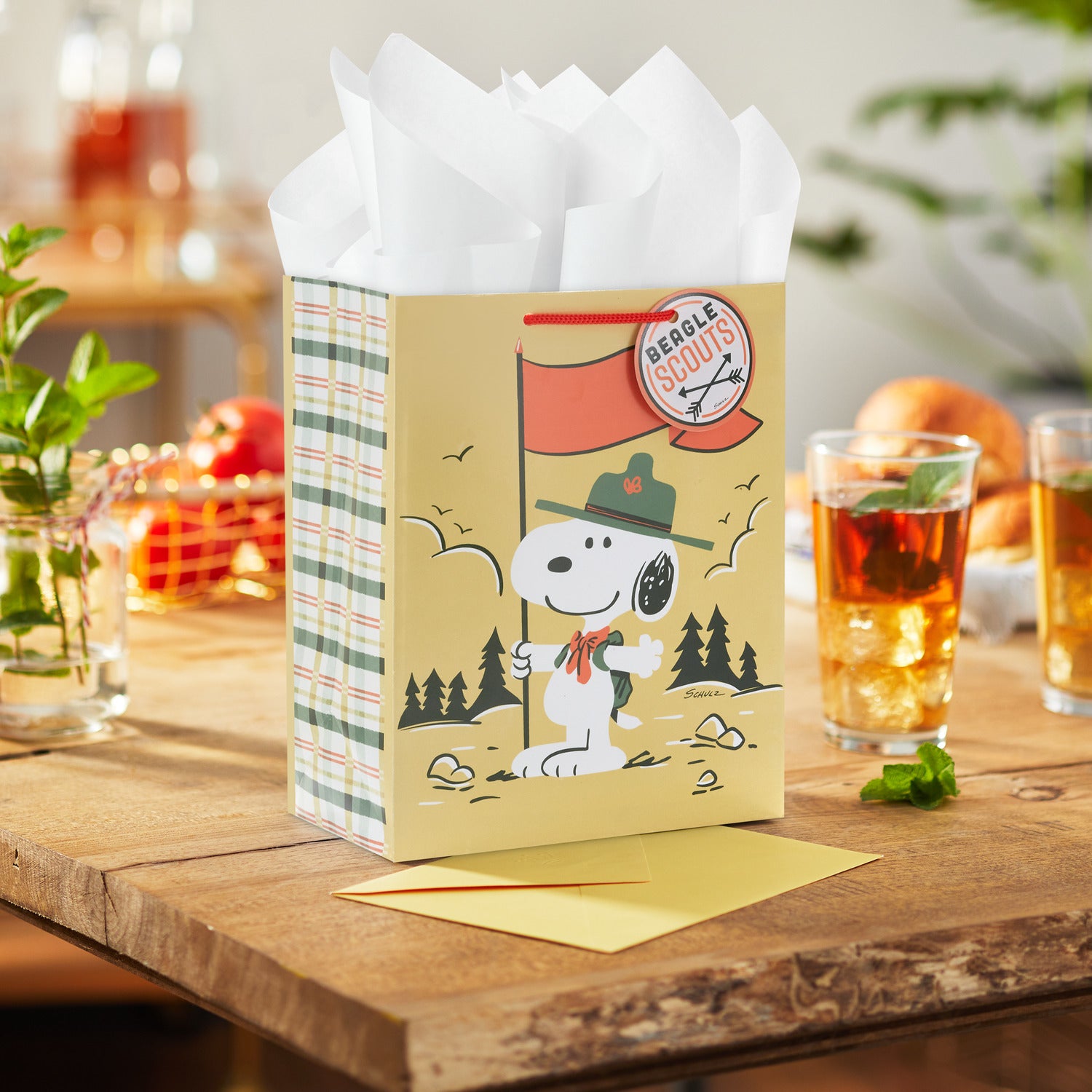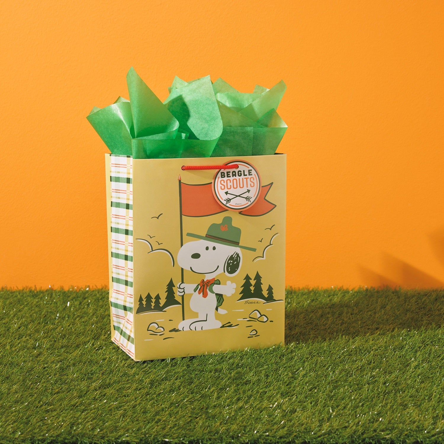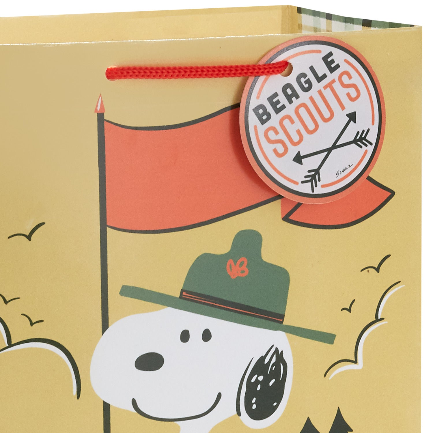 ビーグル・スカウトの帽子、たすき、リュックを背負ったスヌーピーが、荒野にオレンジ色の旗を立てているミディアムサイズのギフトバッグ。