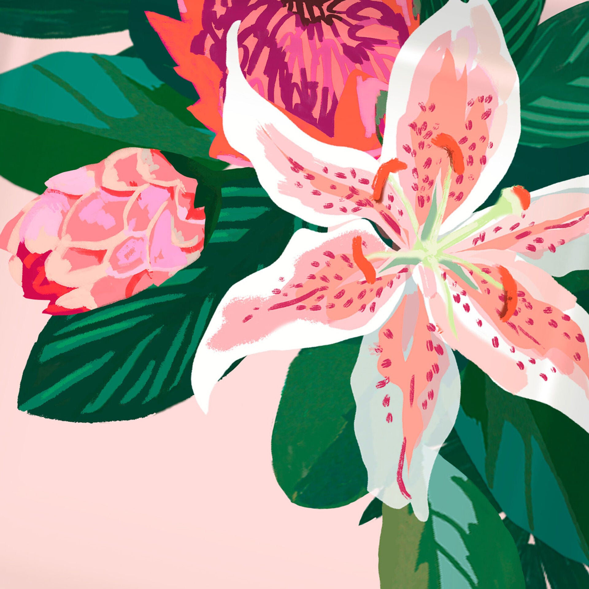 華やかなスターゲイザーリリーを中心に、葉っぱのような花柄がデザインされたピンクのディナープレートで、自然の美しさをテーブルセッティングに取り入れましょう。母の日のブランチや、ベビーガールのシャワー、イースターのお祝いなどに最適です。