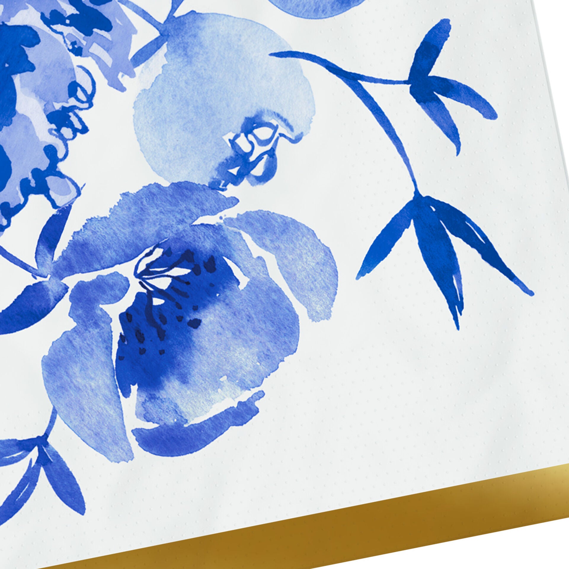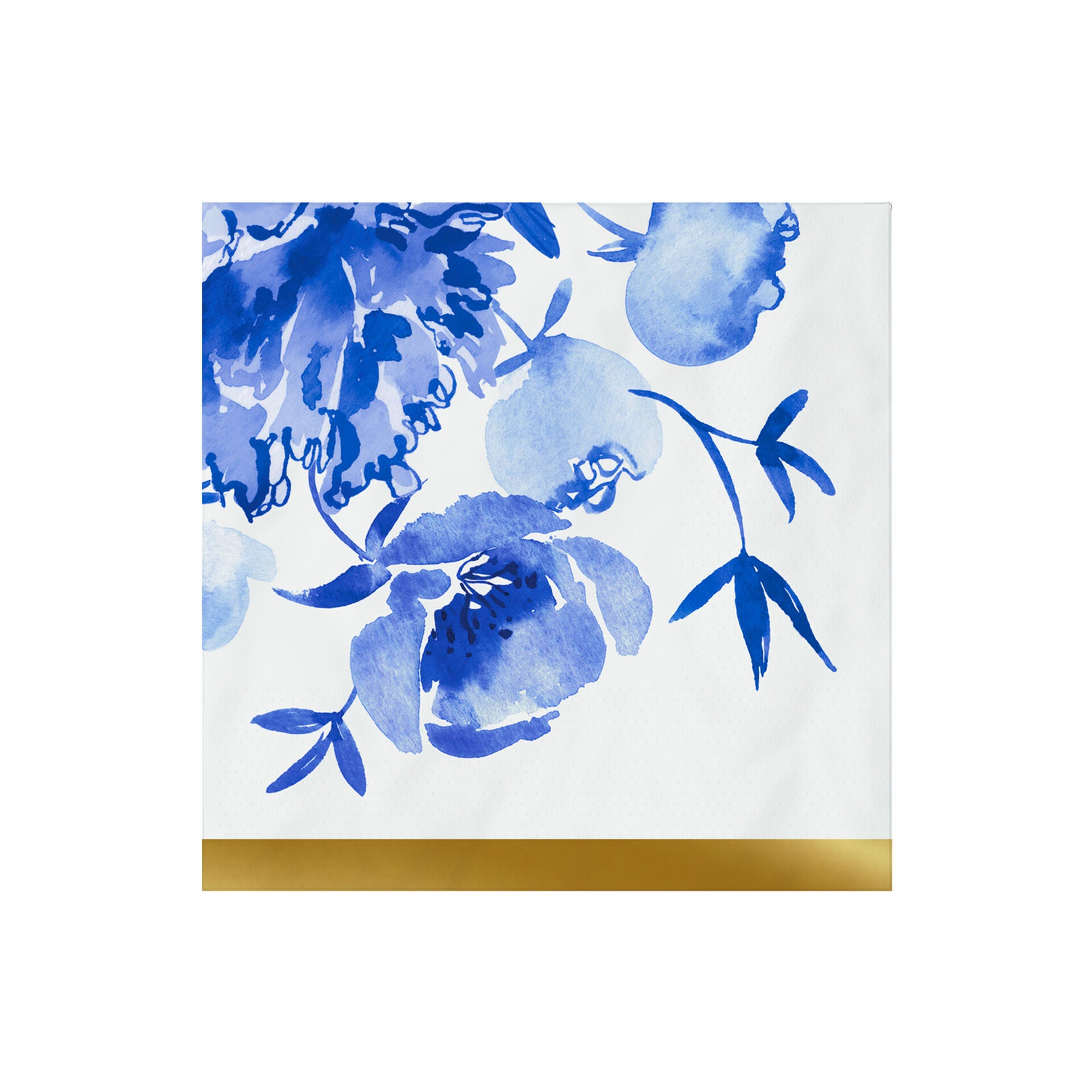 ブルーの花柄とホワイトのカクテルナプキンで、テーブルをエレガントに演出しましょう。コバルトブルーの花柄で、下縁に幅広のゴールドフォイルが施されたペーパーナプキンは、ウェディングやベビーシャワー、卒業パーティー、記念日などに最適です。