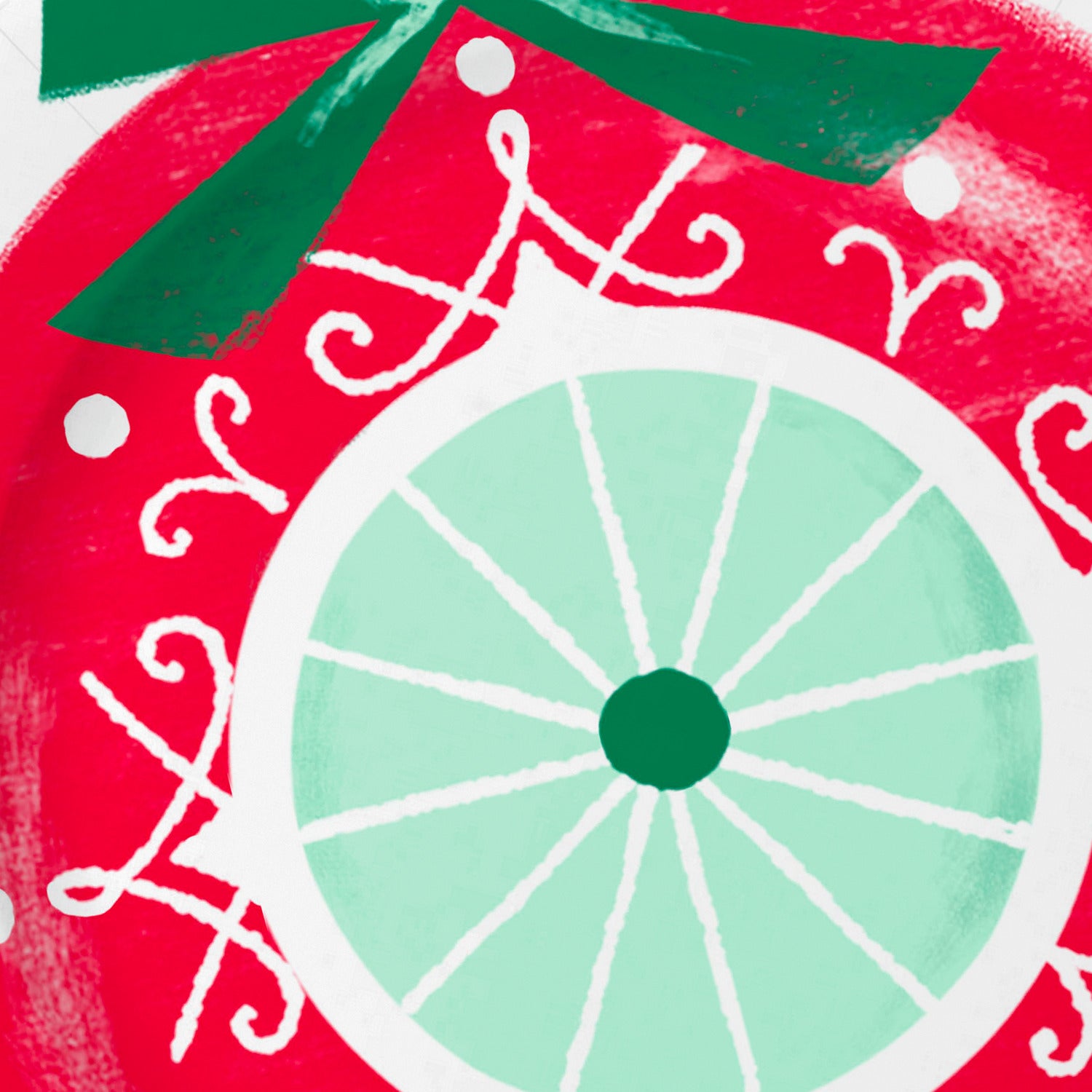 ホールマークのデザートプレートを並べれば、スイーツや前菜、軽食のテーブルにノスタルジックな楽しさが広がります。丸い紙皿には、鮮やかな赤にグリーンのアクセントが効いたレトロなオーナメントが描かれています。