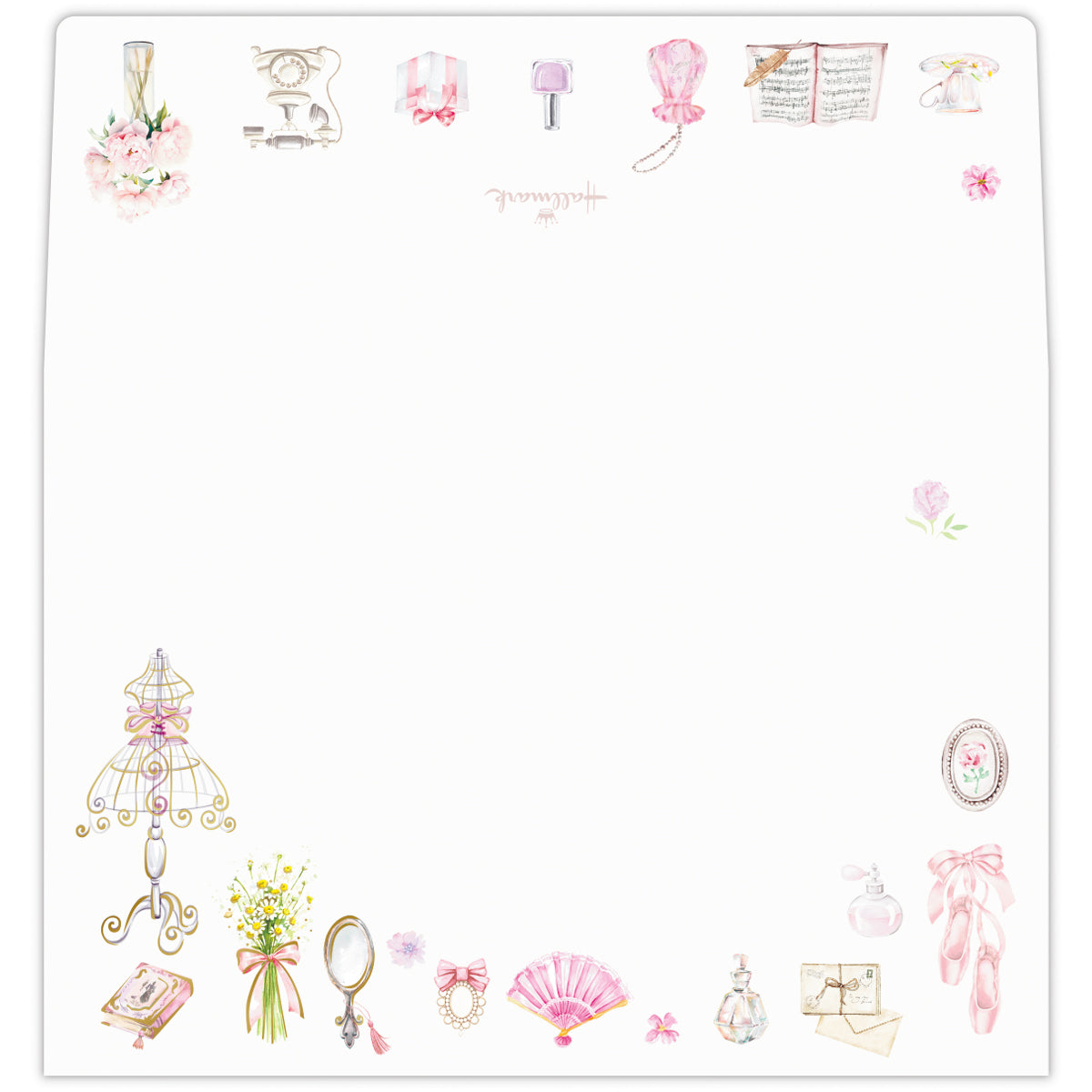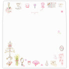 バレエシューズやアンティークのティーカップ、香水瓶、ブーケなど、心ときめく小物たちを集めました。甘くなりすぎないグレイッシュなピンクを使い、大人も使いやすいフェミニンなデザインに仕上げています。