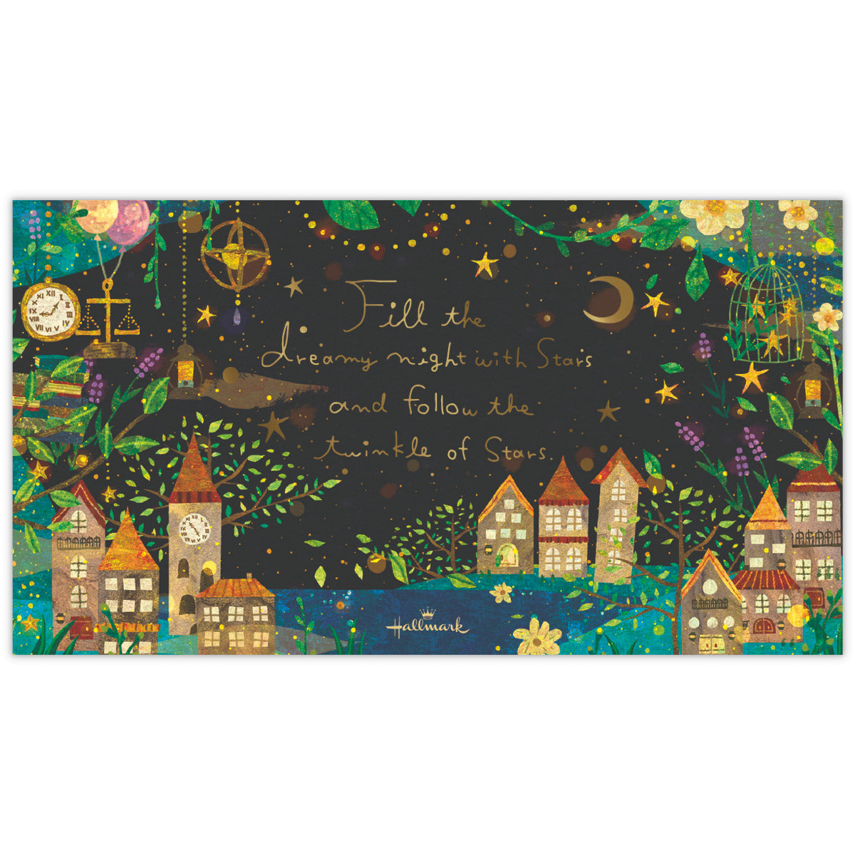 秋から冬にかけて使いやすい落ち着いたトーンのレターコレクション「コンフォート&ピース」。イラストレーター「むうめぐ」が描き出す、絵本のように幻想的であたたかみのある世界観。きらきら輝く金箔加工が、星の瞬く夜の風景を引き立てます。