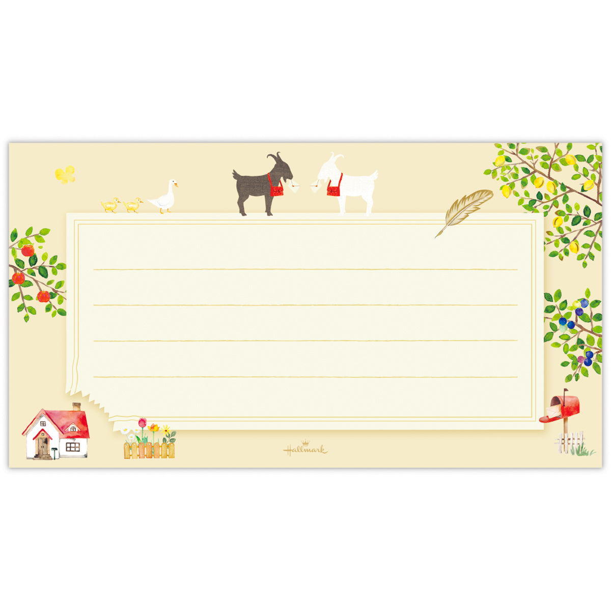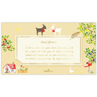 お手紙を書くシーンと親和性の高い童謡「やぎさんゆうびん」の世界観をテーマに、海外の絵本の装丁をイメージしてデザインしました。お手紙の左下がヤギにかじられたようになっているあしらいがチャームポイントです。