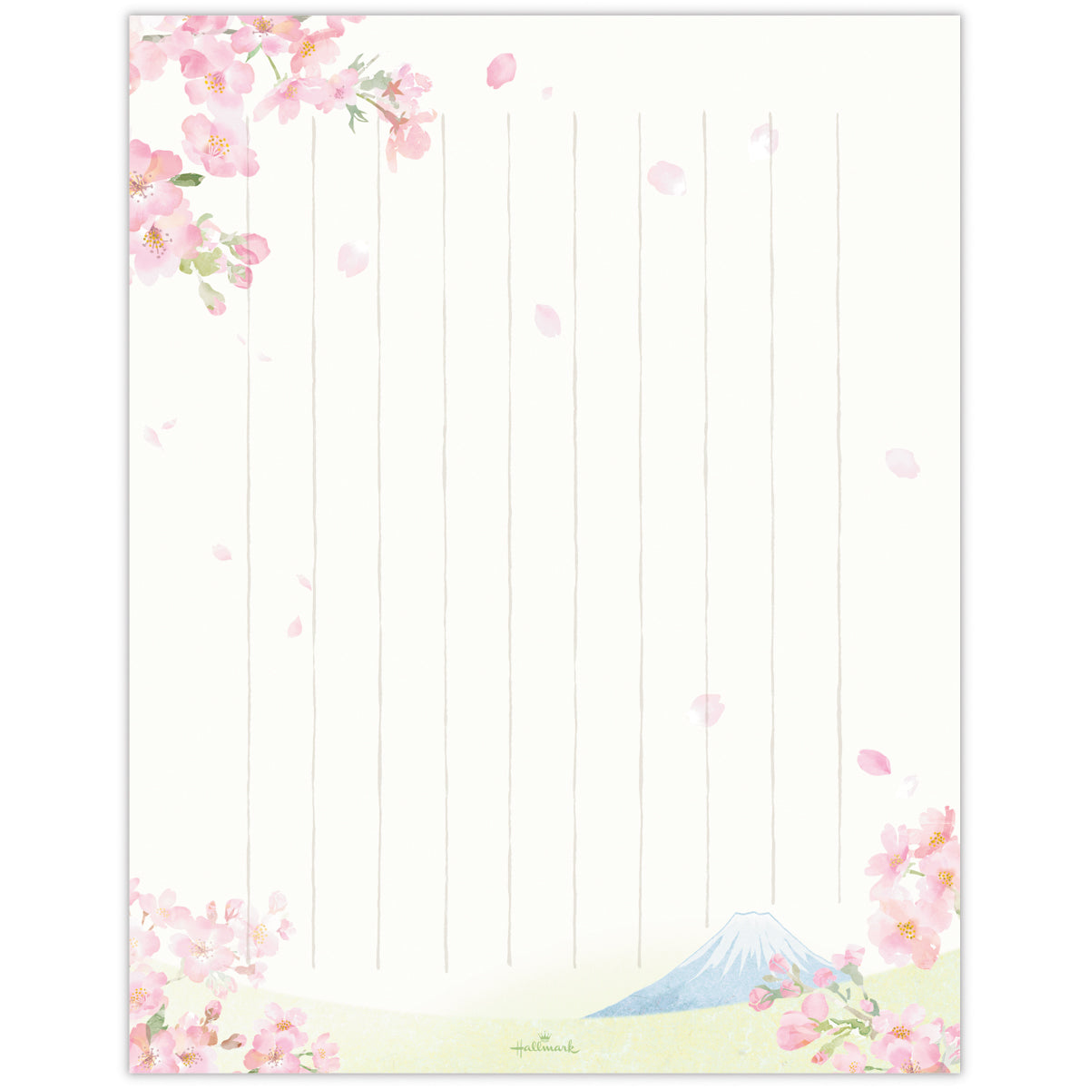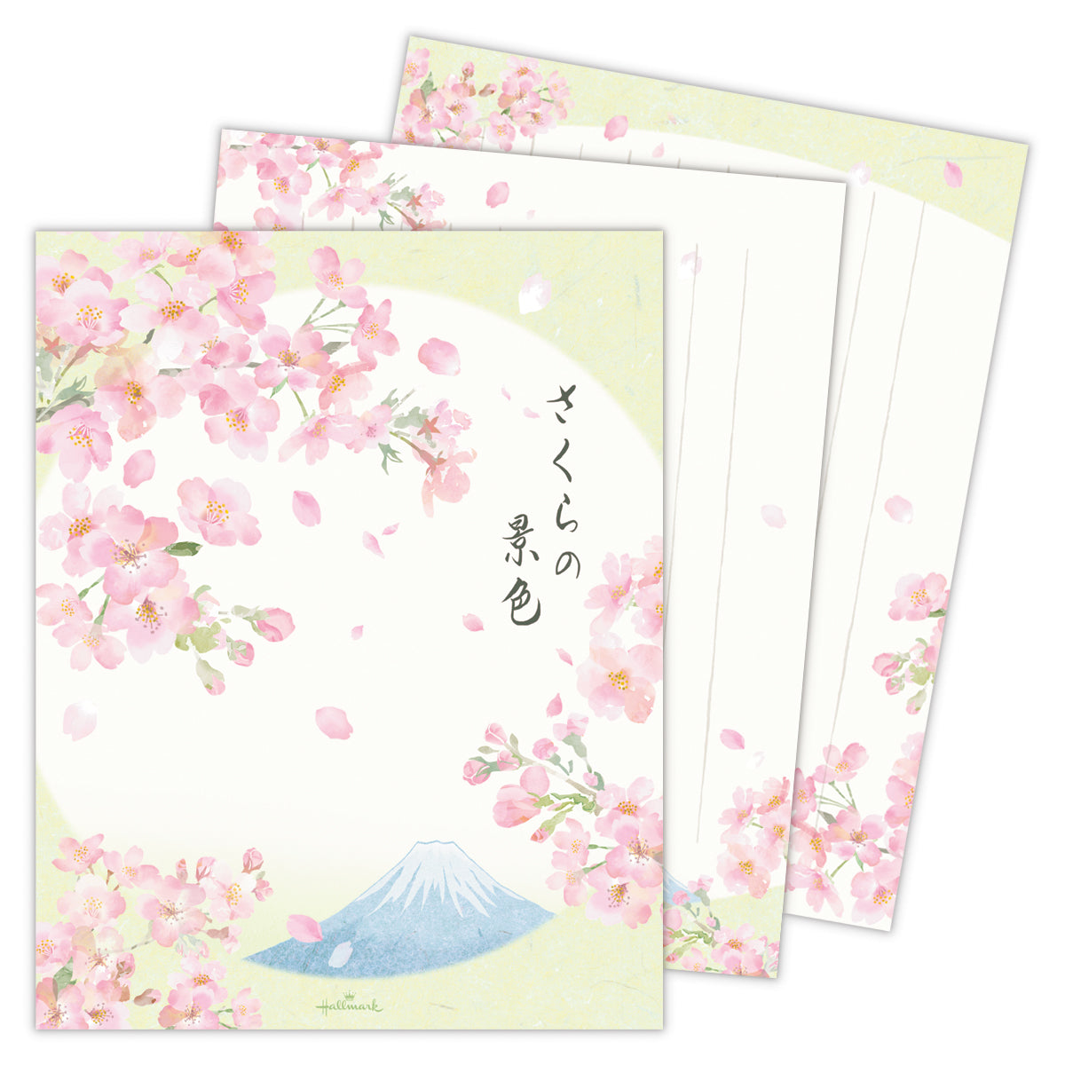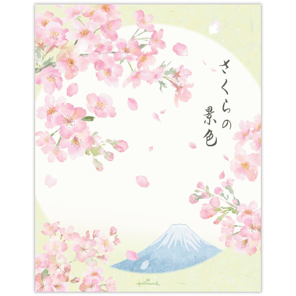 満開の桜と富士山を描いた上品な和風デザイン。晴れた日に和室から優雅な桜と富士山を眺めているシーンをイメージしました。海外の方へ贈るお手紙やお土産にもおすすめです。