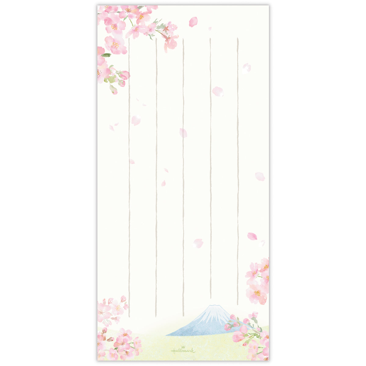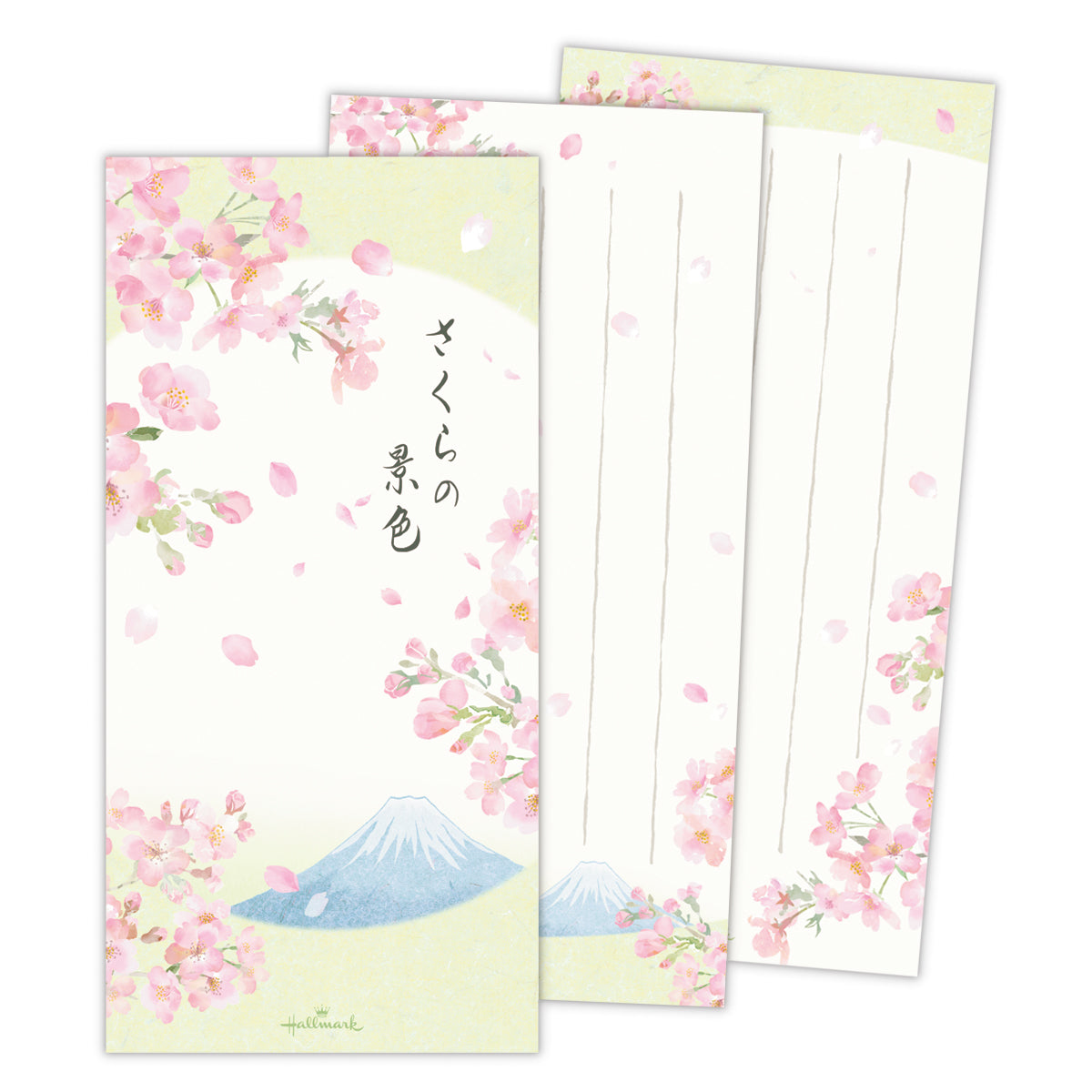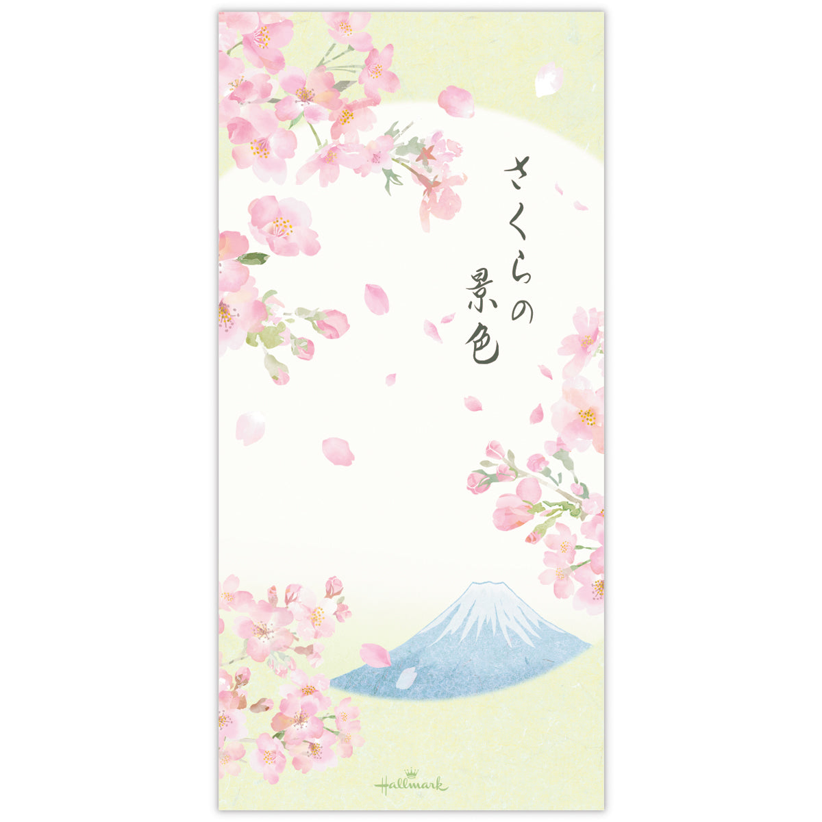 満開の桜と富士山を描いた上品な和風デザイン。晴れた日に和室から優雅な桜と富士山を眺めているシーンをイメージしました。海外の方へ贈るお手紙やお土産にもおすすめです。