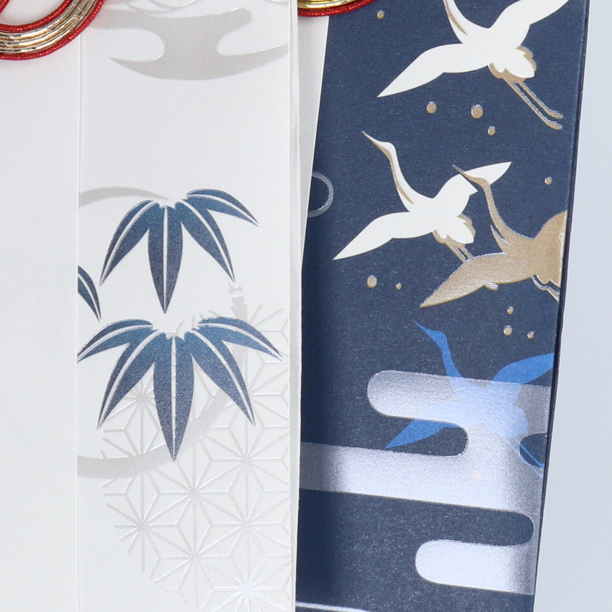 夫婦円満の象徴である「鶴」が大空を翔けていく様子を、シンプルなカラーとパール箔で洗練された印象に仕上げました。小さな鞄に入れやすいスリムサイズです。