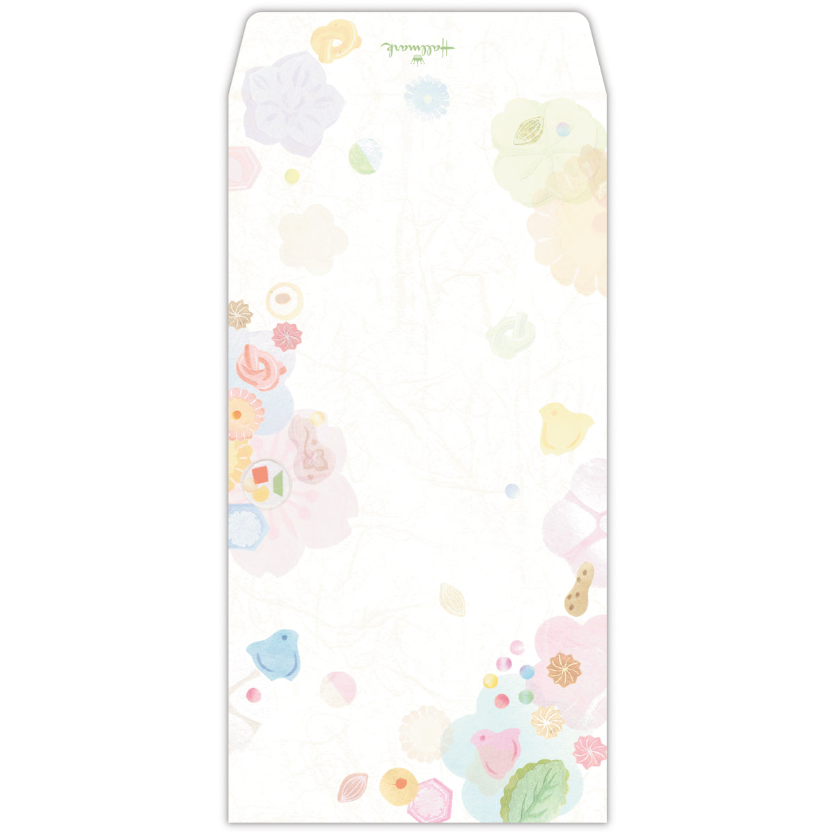「風が運ぶ愛らしいものたち」の意味を持つ京都の伝統菓子「ふきよせ」がモチーフ。自社の和柄レターを多数手がけているコラージュ作家・おのみちこによる可愛らしい貼り絵がポイントです。
