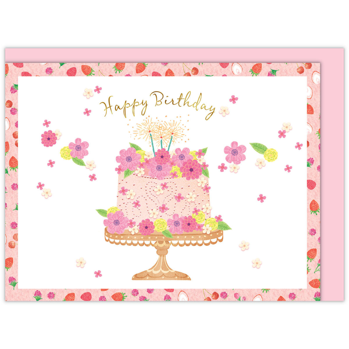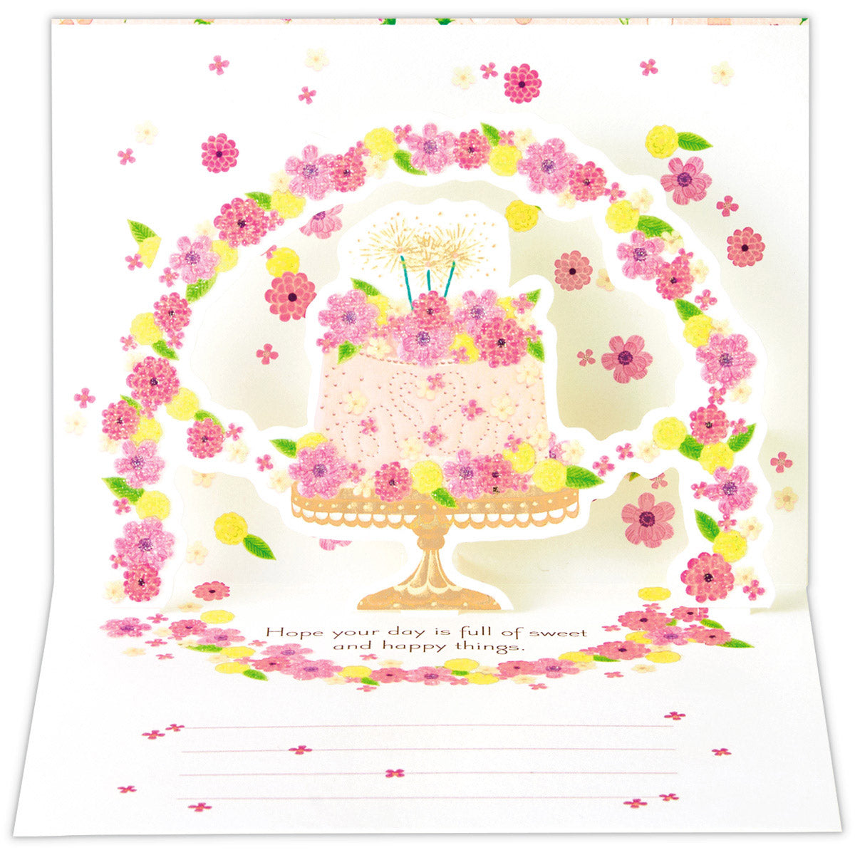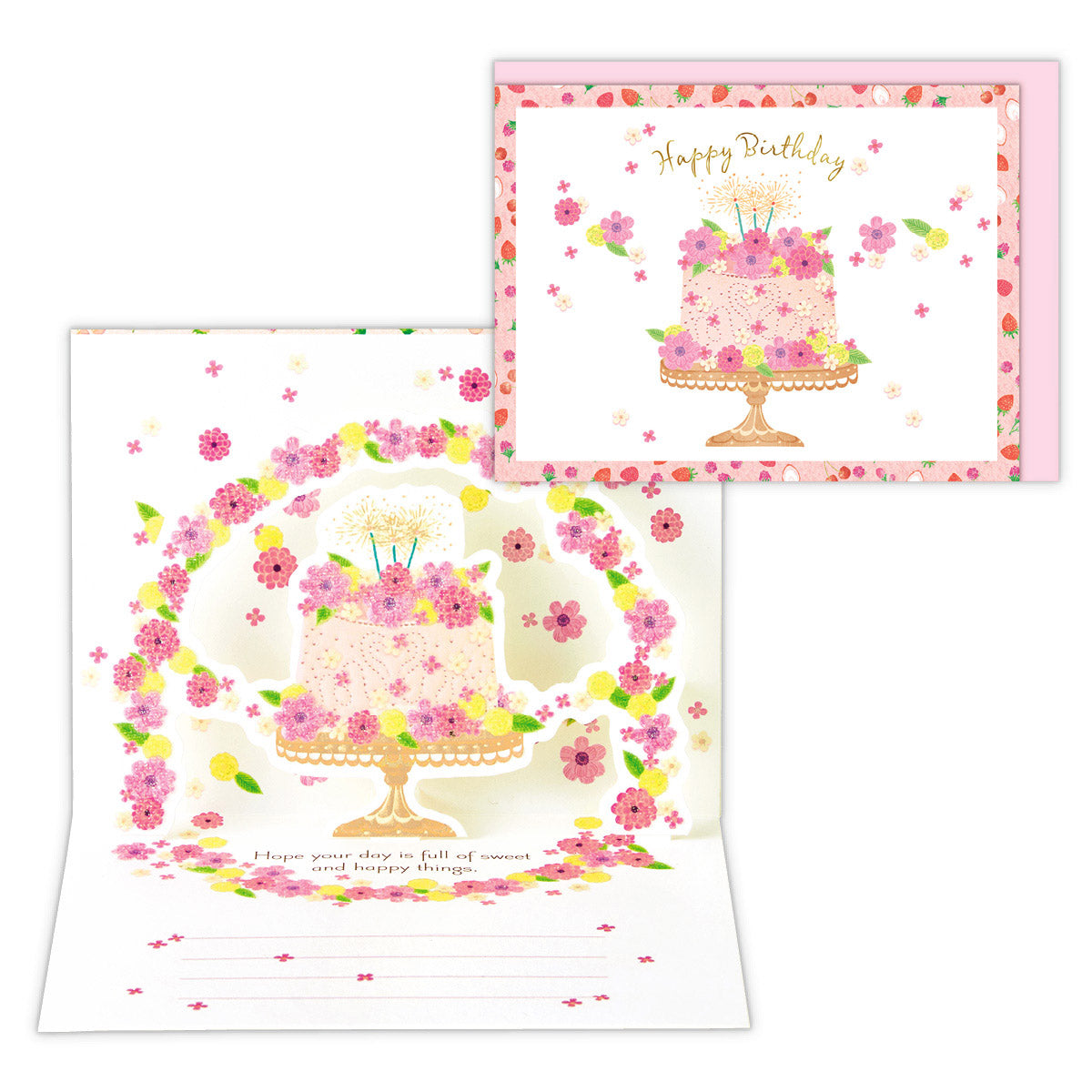 ピンク基調の花々とケーキがポップアップするエレガントなバースデーカード。ラメ加工・エンボス加工・箔加工を使用して華やかに仕上げました。