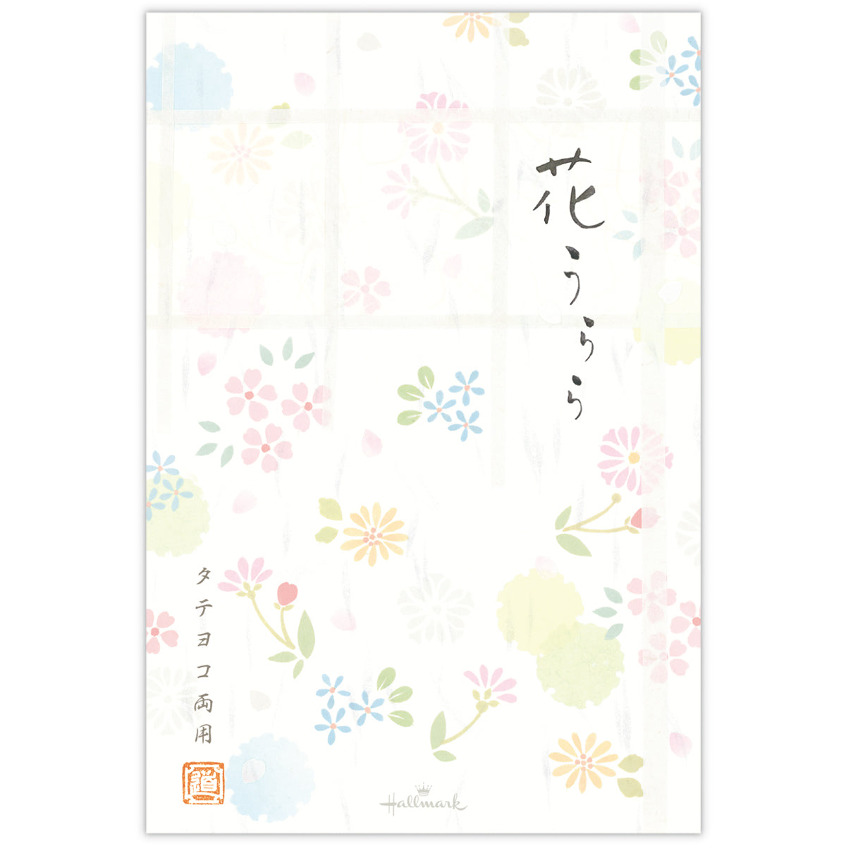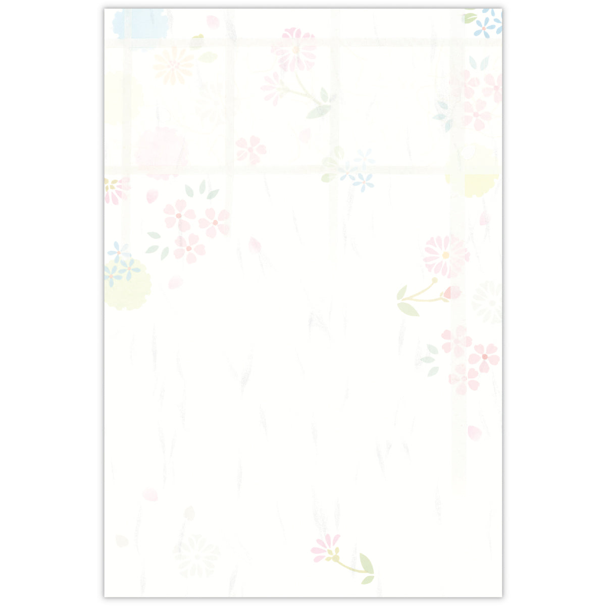 和室の障子紙に描かれた花模様が、やわらかな日差しによって浮かび上がるシーンをイメージしました。すっきりと白い背景に、花の貼り絵が映える可愛らしいデザイン。罫線無しなので縦書きにも横書きにもお使いいただけます。