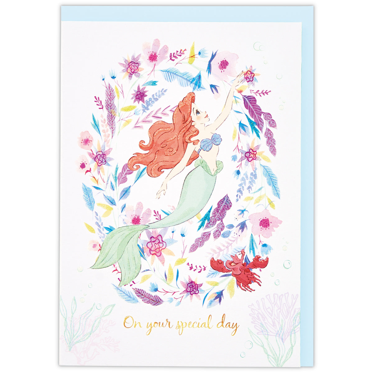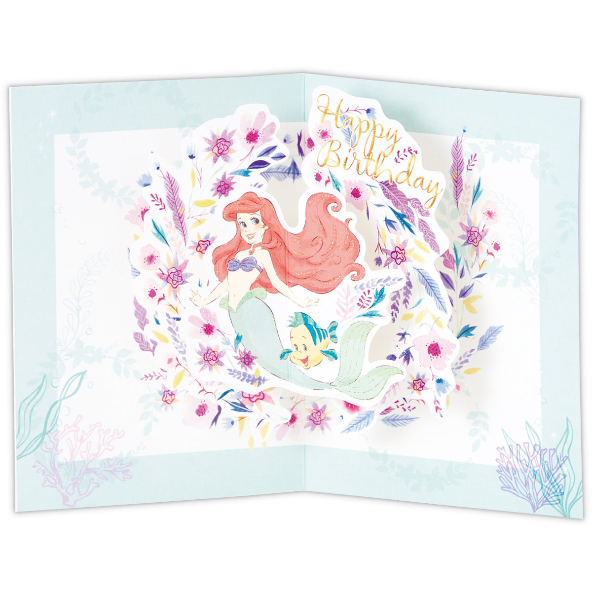 アリエルと華やかなフラワーリースを涼しげな色合いで描きました。リトル・マーメイドがお好きな方にぜひ贈りたいバースデーカードです。