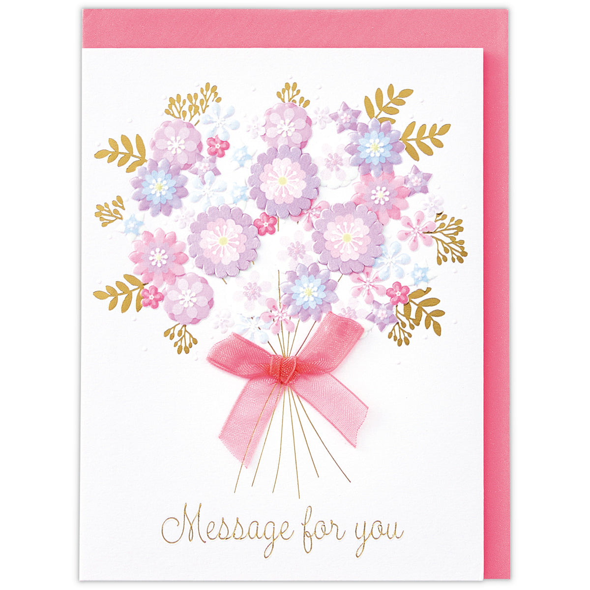 初夏に贈りたい爽やかな色合いのブーケを、存在感たっぷりにデザイン。3Dエンボスとアタッチメントによる立体的な表現がポイント。ブーケのリボンには透け感のあるシフォンリボンを採用し、涼しげな印象に仕上げています。