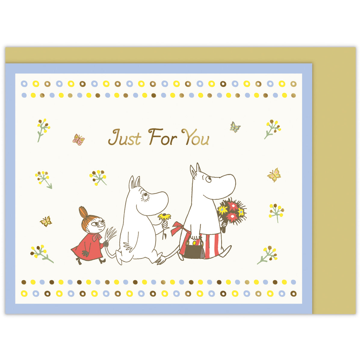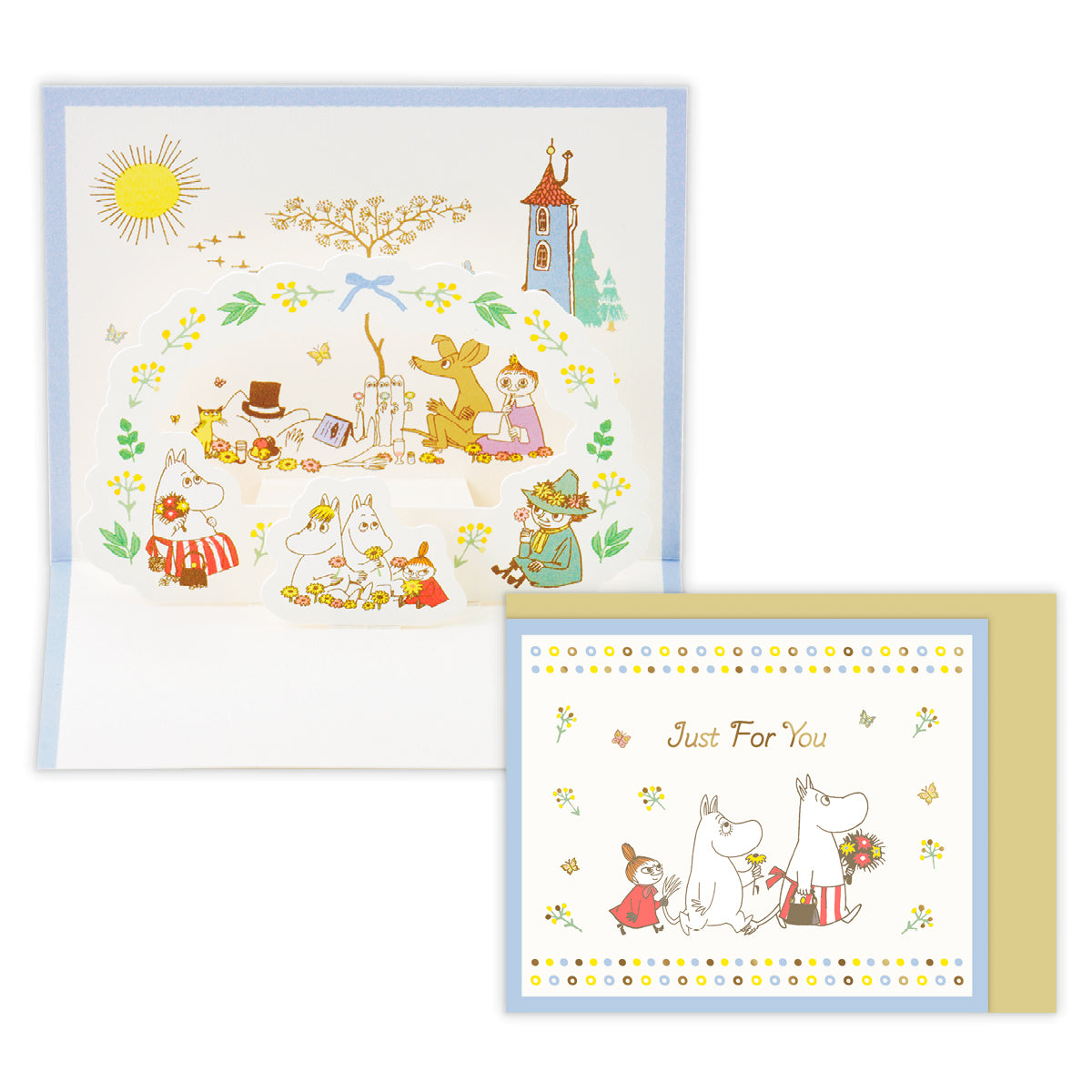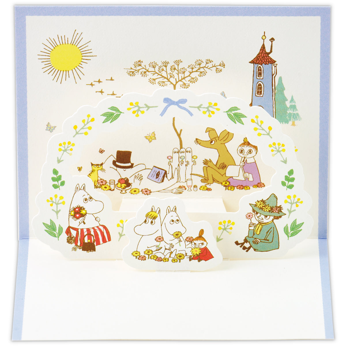 ちょっとしたメッセージを書いたりギフトに添えたりしやすい立体ミニカード。カードを開くと、可愛らしい黄色いお花のアーチに囲まれたムーミン谷の仲間たちがポップアップします。