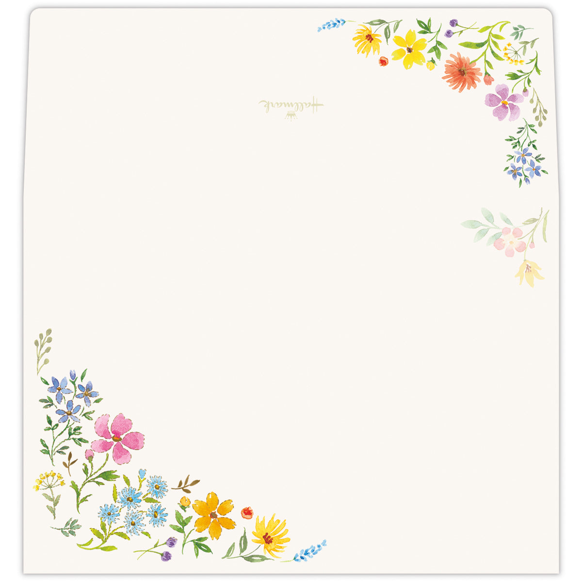 定番人気の花柄レターを、横位置のレイアウトで新鮮な印象に。金箔加工を施したタイトルと、その周りに咲くように描かれた色とりどりのお花が目を引くエレガントなデザインです。