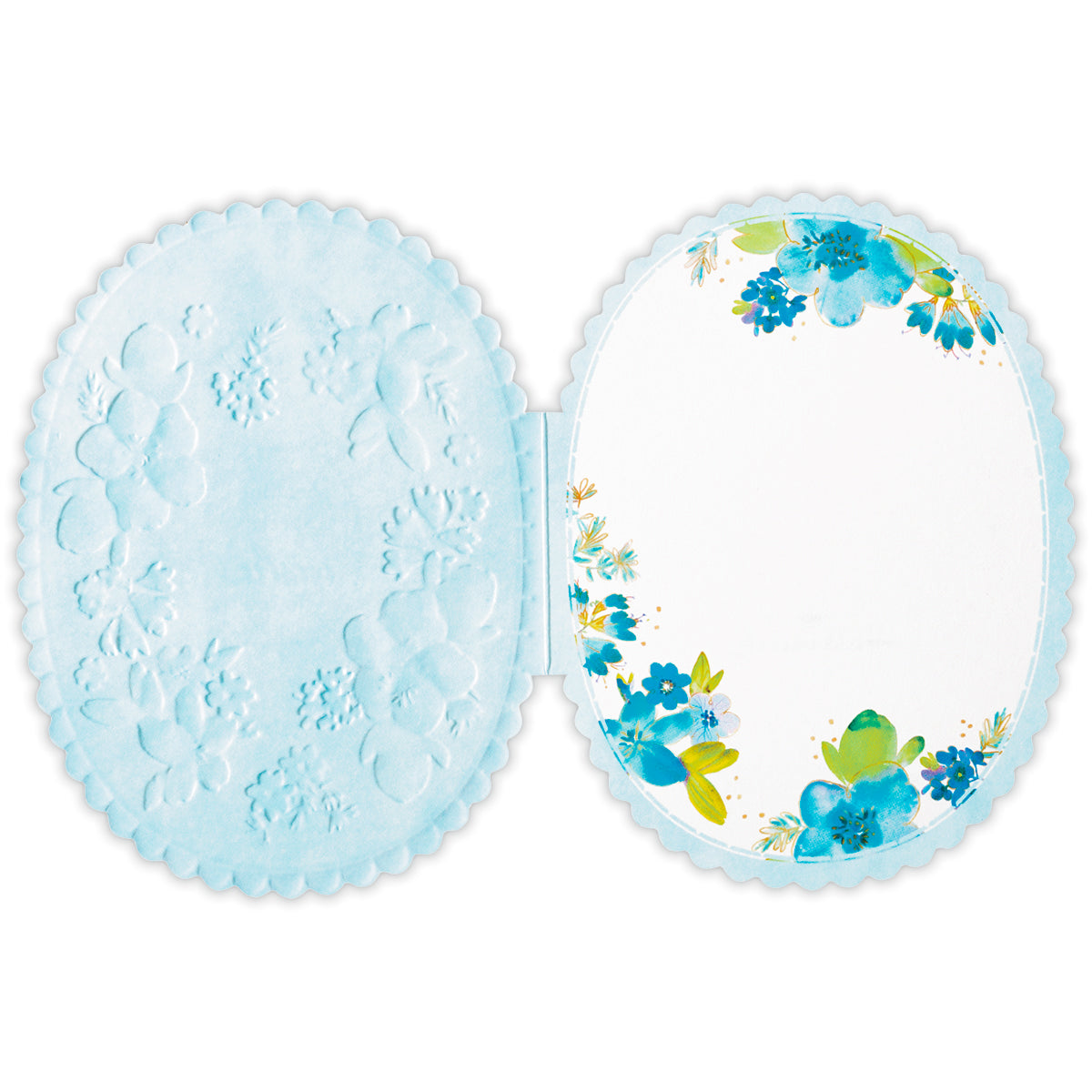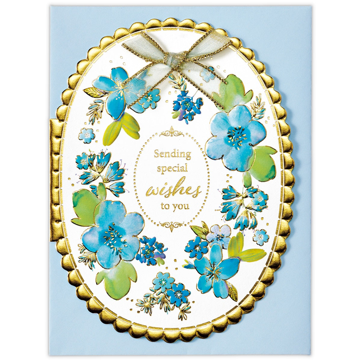 カード全体にダイカットを施した、やわらかく上品な印象のカードです。優しい水彩タッチで描かれたお花と、金の縁取りが施されたリボンがエレガントな雰囲気を演出します。