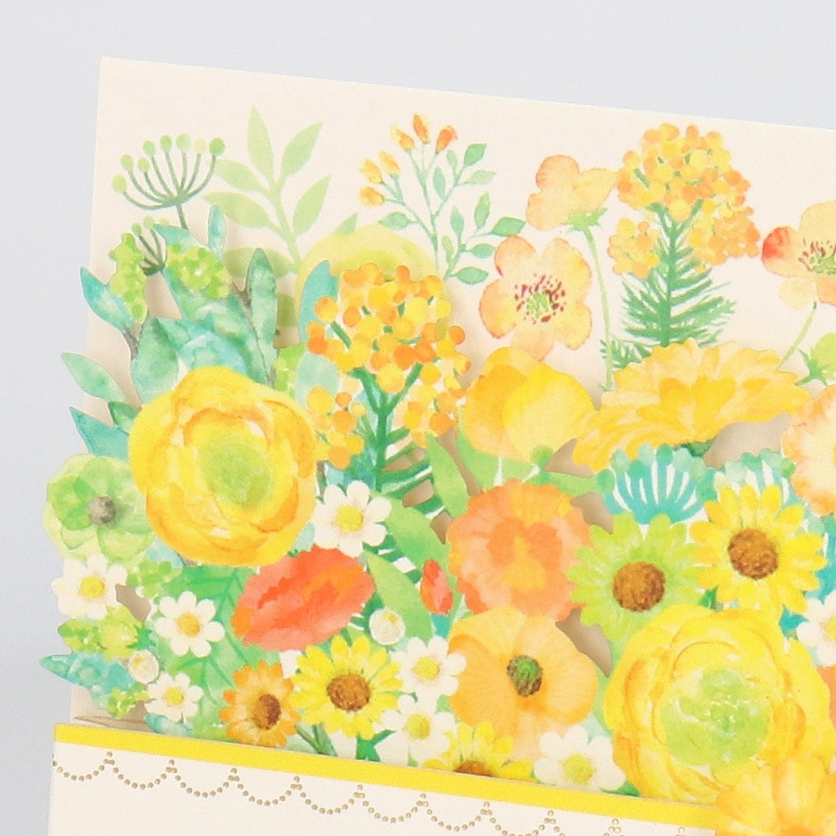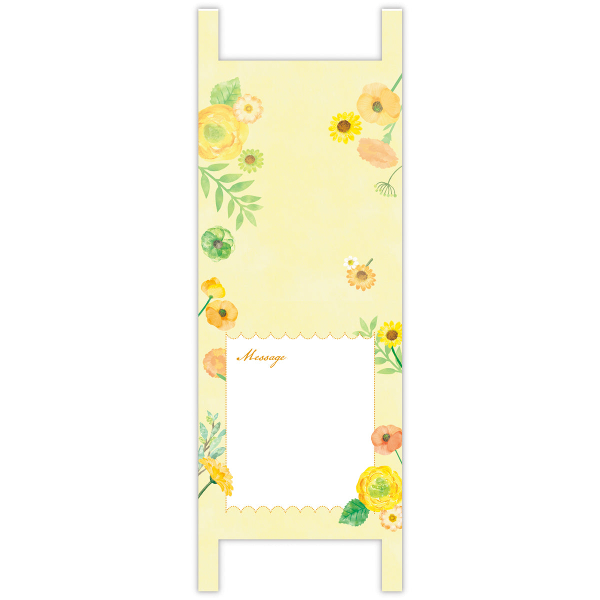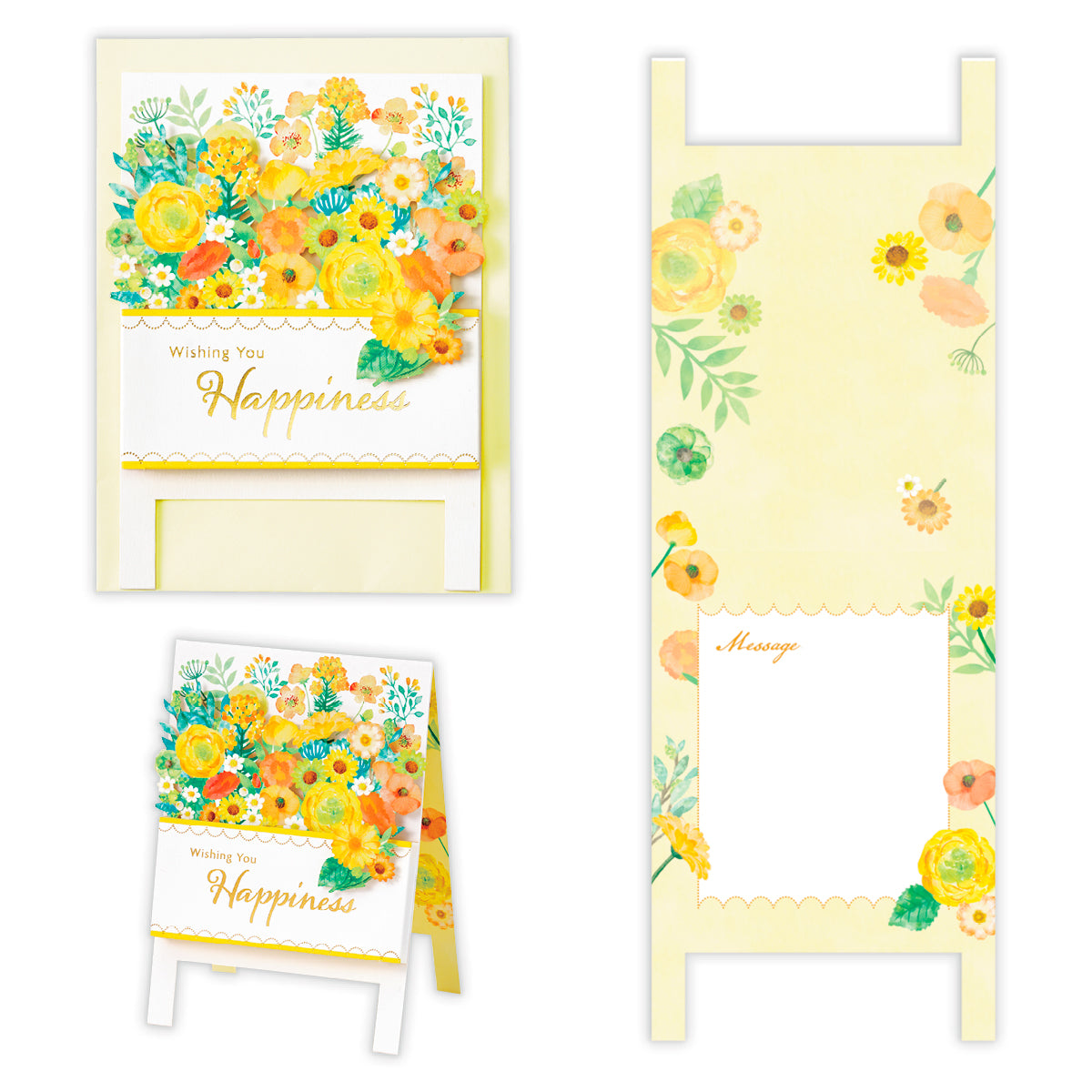 みずみずしい水彩タッチで色鮮やかな黄色やオレンジのお花を描いた多目的カード。お祝いのお花があふれんばかりに飾られた、華やかなフラワーボードを表現しました。