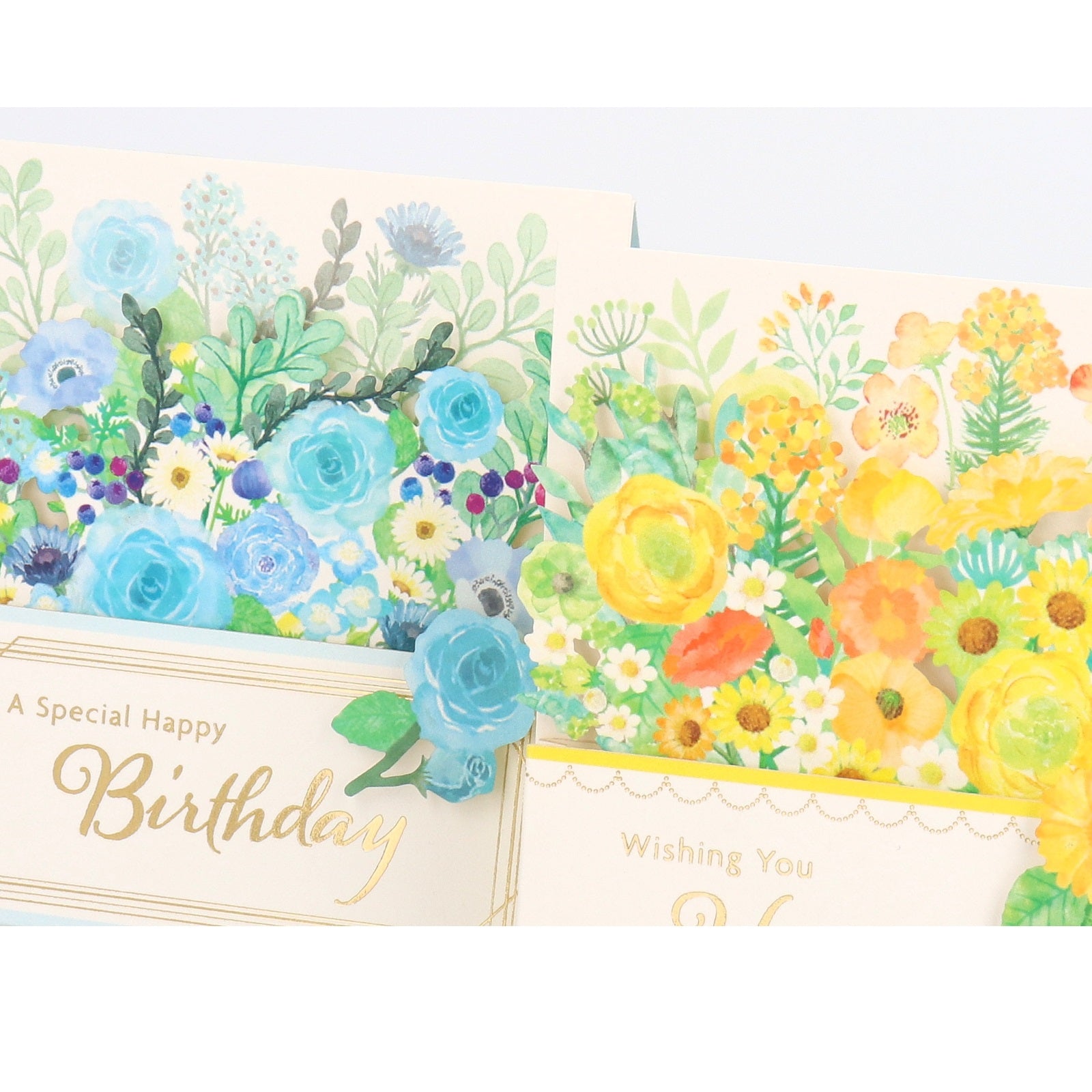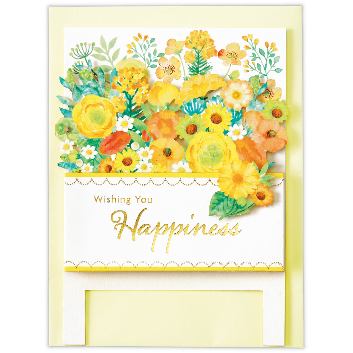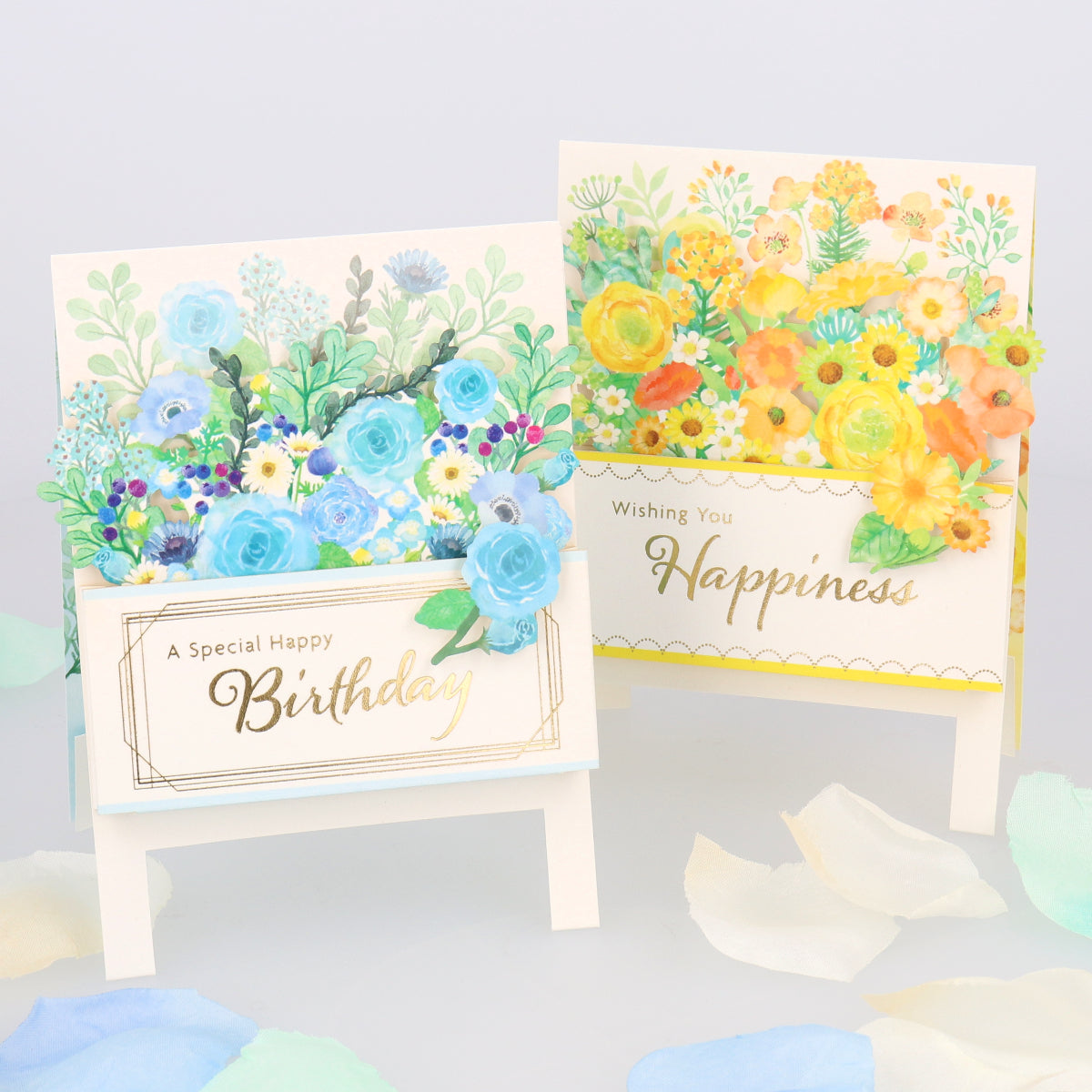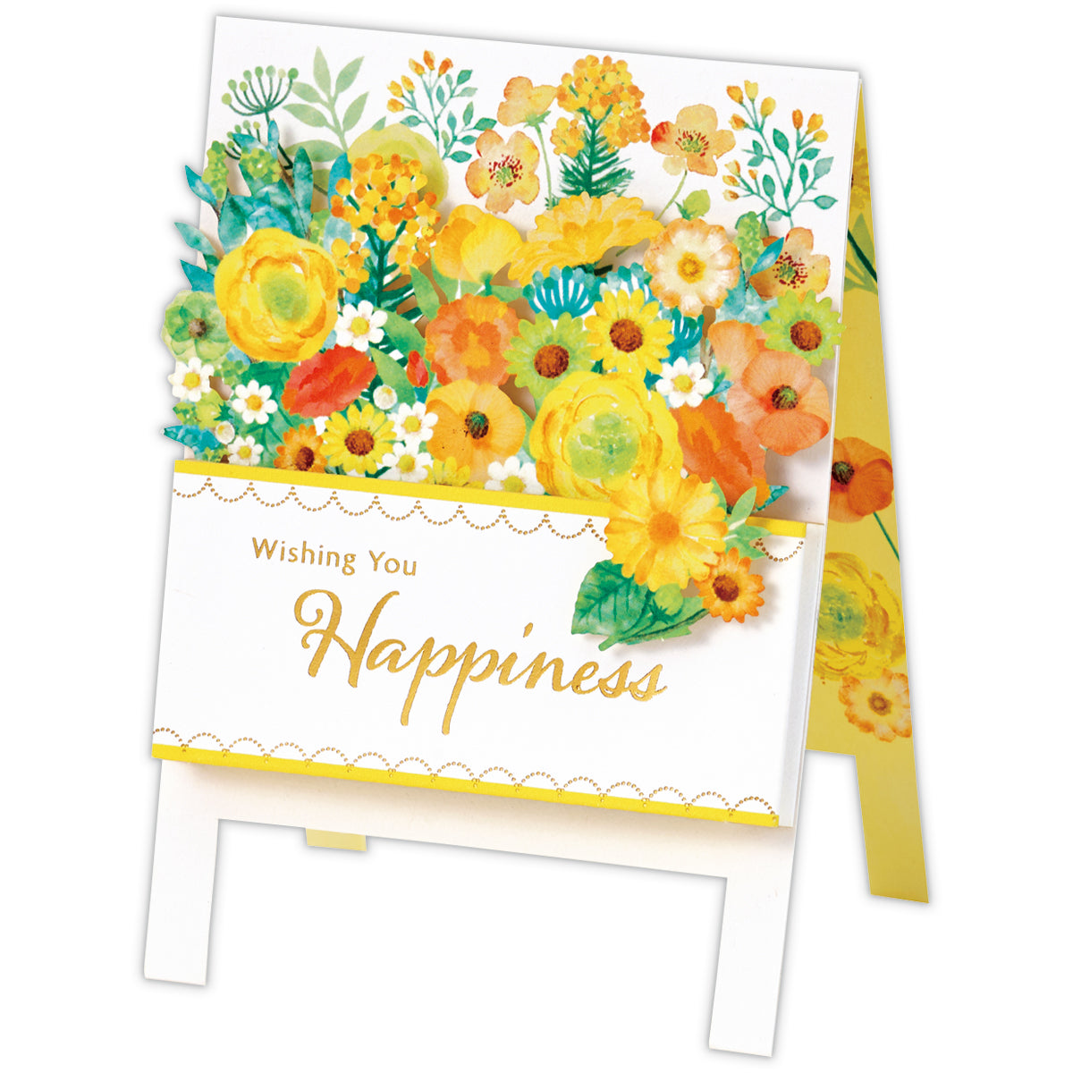 みずみずしい水彩タッチで色鮮やかな黄色やオレンジのお花を描いた多目的カード。お祝いのお花があふれんばかりに飾られた、華やかなフラワーボードを表現しました。