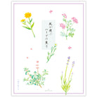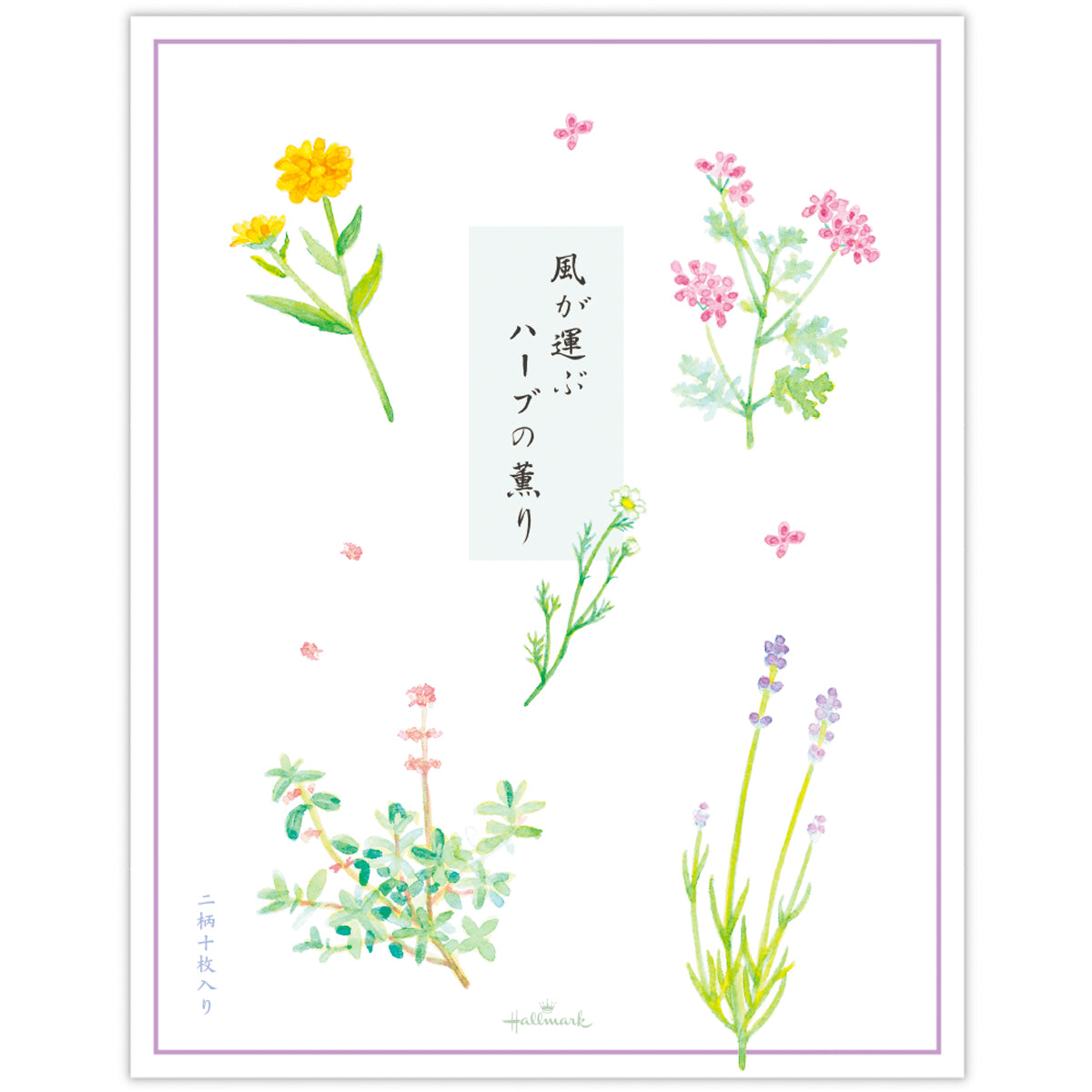 みずみずしいゼラニウム、輝くキンセンカ、優美なカモミール、穏やかなラベンダー、芳しいセージ。摘みたてのハーブの香りがそっと立ちのぼる場面をイメージしながら、水彩のやわらかなタッチで花々を描きました。