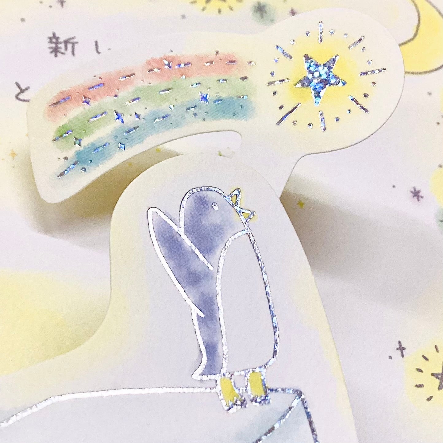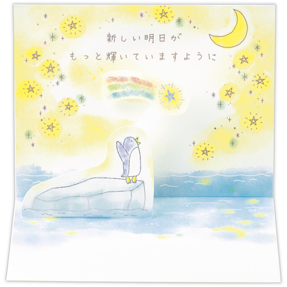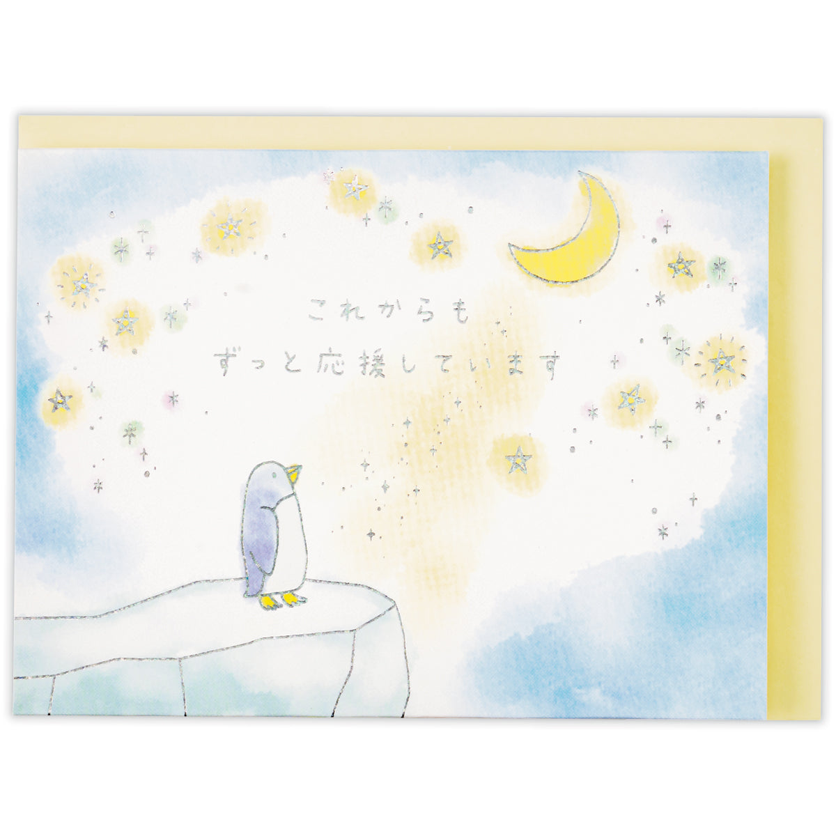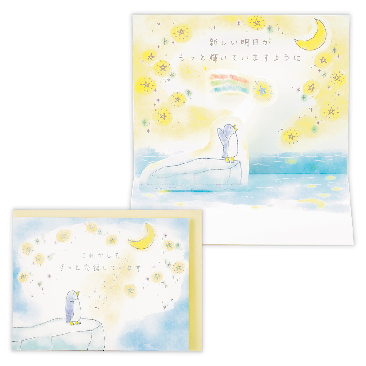 新生活のタイミングにもおすすめな「応援」がテーマの多目的カードが登場! ホログラムがきらめく箔線画のペンギンが、明るい未来に向けて応援メッセージを届けてくれます。