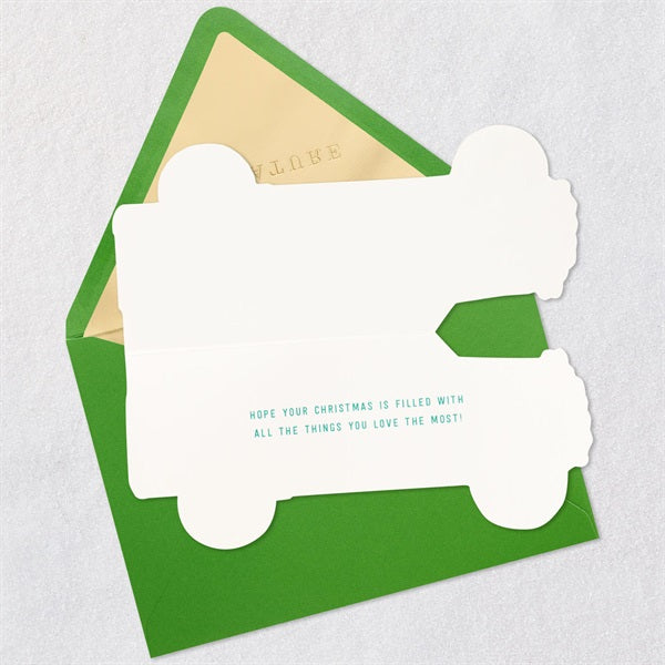 もみの木と赤いトラックがクリスマスをお届け!米国ではおうちクリスマスの定番である「ホールマーク・チャンネル」の文字が入った、もみの木を運ぶ赤いトラックのクリスマスカードです。