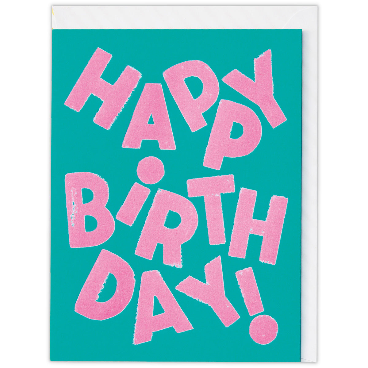 ちょっとひねりのあるデザインが魅力的なZ世代に向けたラインナップ! 「HAPPY BIRTHDAY!」の文字をポップにレイアウト。ターコイズ×ピンクの対比がスタイリッシュなデザインです。