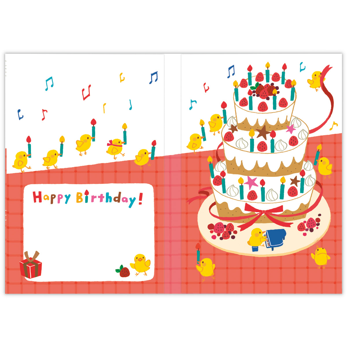 カードを開くとメロディーが流れる二つ折りのオルゴールカード。ひよこたちがバースデーケーキの飾りつけをしながら誕生日をお祝いしてくれます。ピヨピヨ可愛い鳴き声入り!