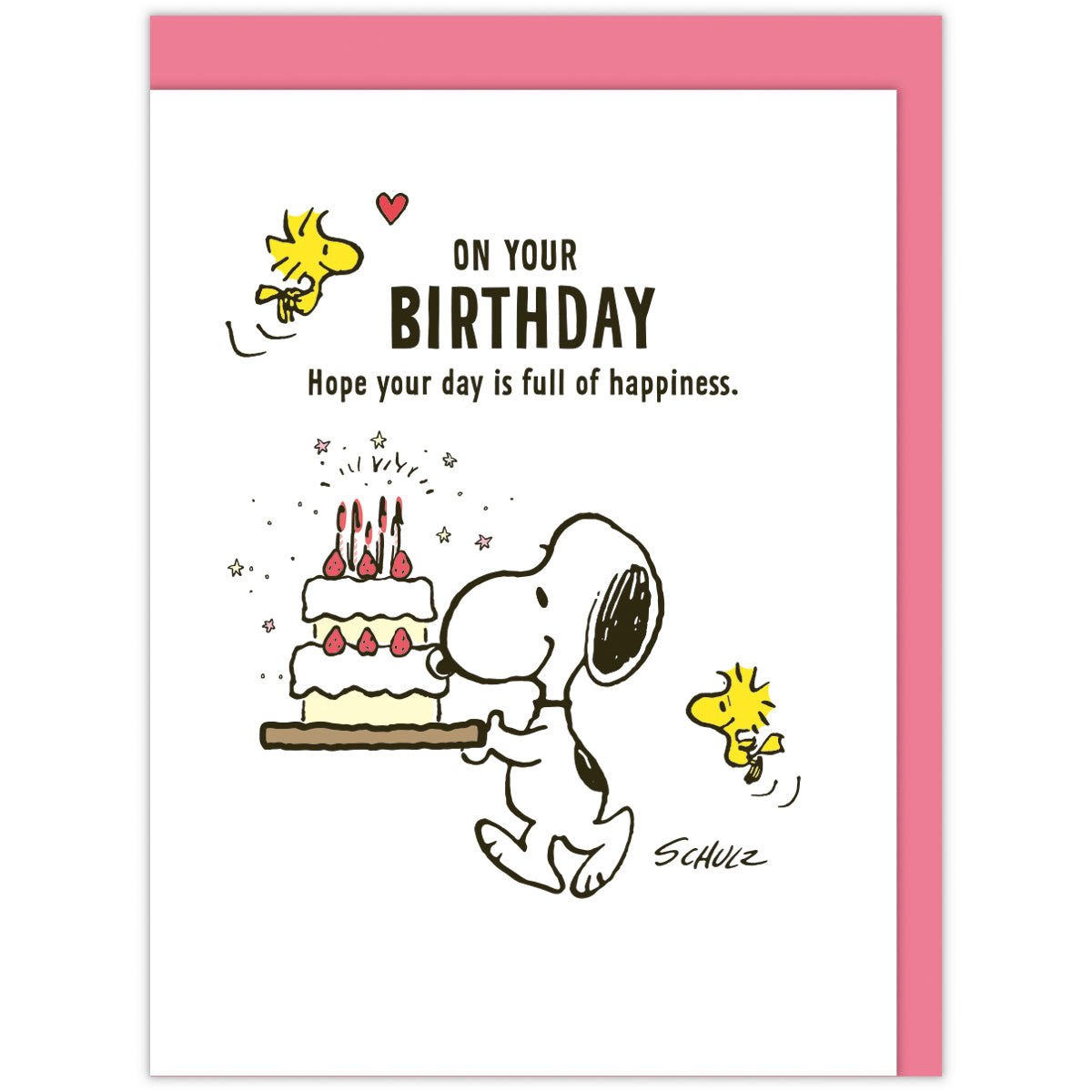 ケーキを運ぶスヌーピーが可愛らしいバースデーカード。絵柄とセンチメントが映えるシンプルなデザインです。カードを開くとケーキの部分がバネで動きます。