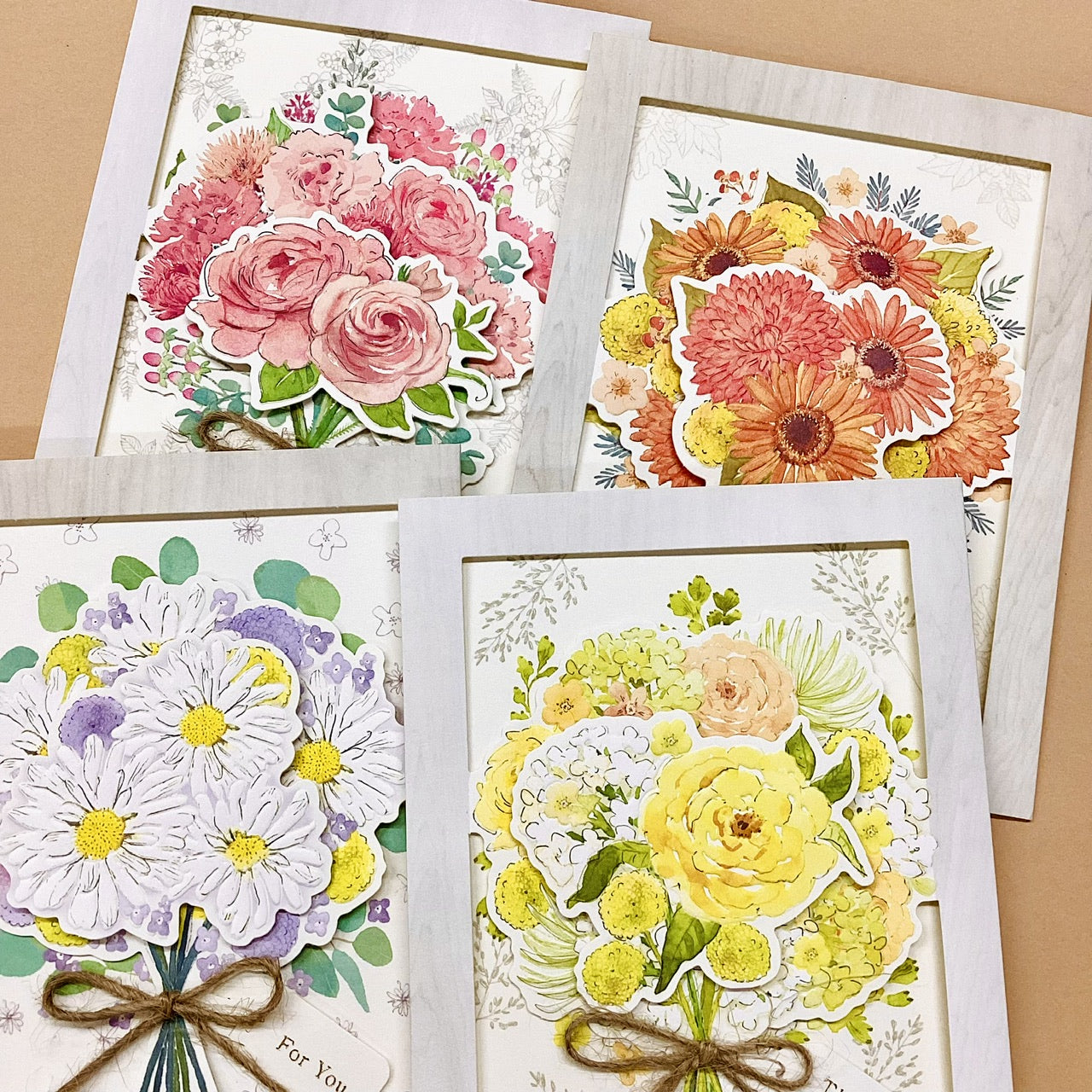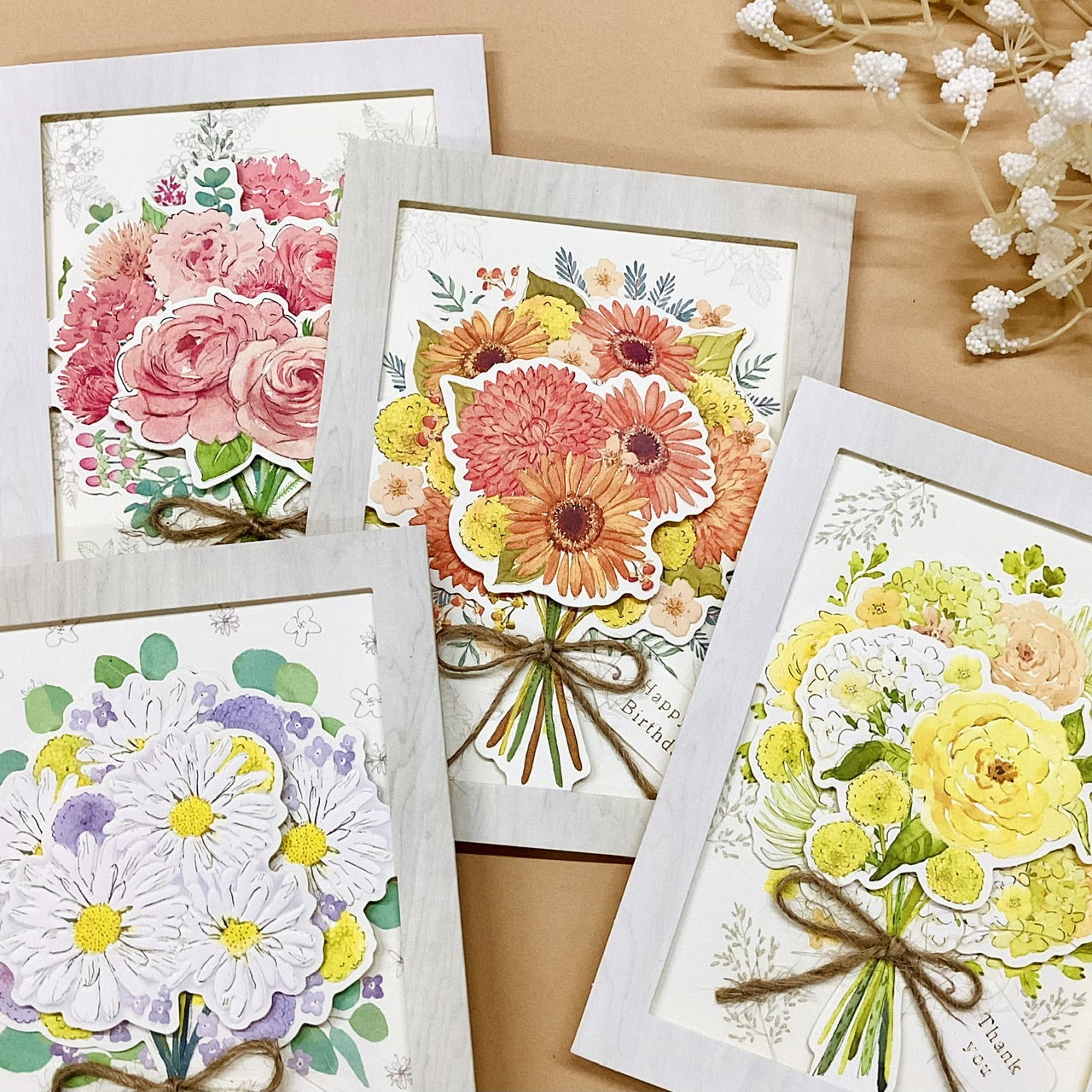 フラワーブーケをモチーフにした人気のカードに、秋から冬のシーズンにもお使いいただきやすいデザインが登場! あたたかみある落ち着いた色合いや花言葉、季節を感じさせる麻ひも素材も注目ポイントです。