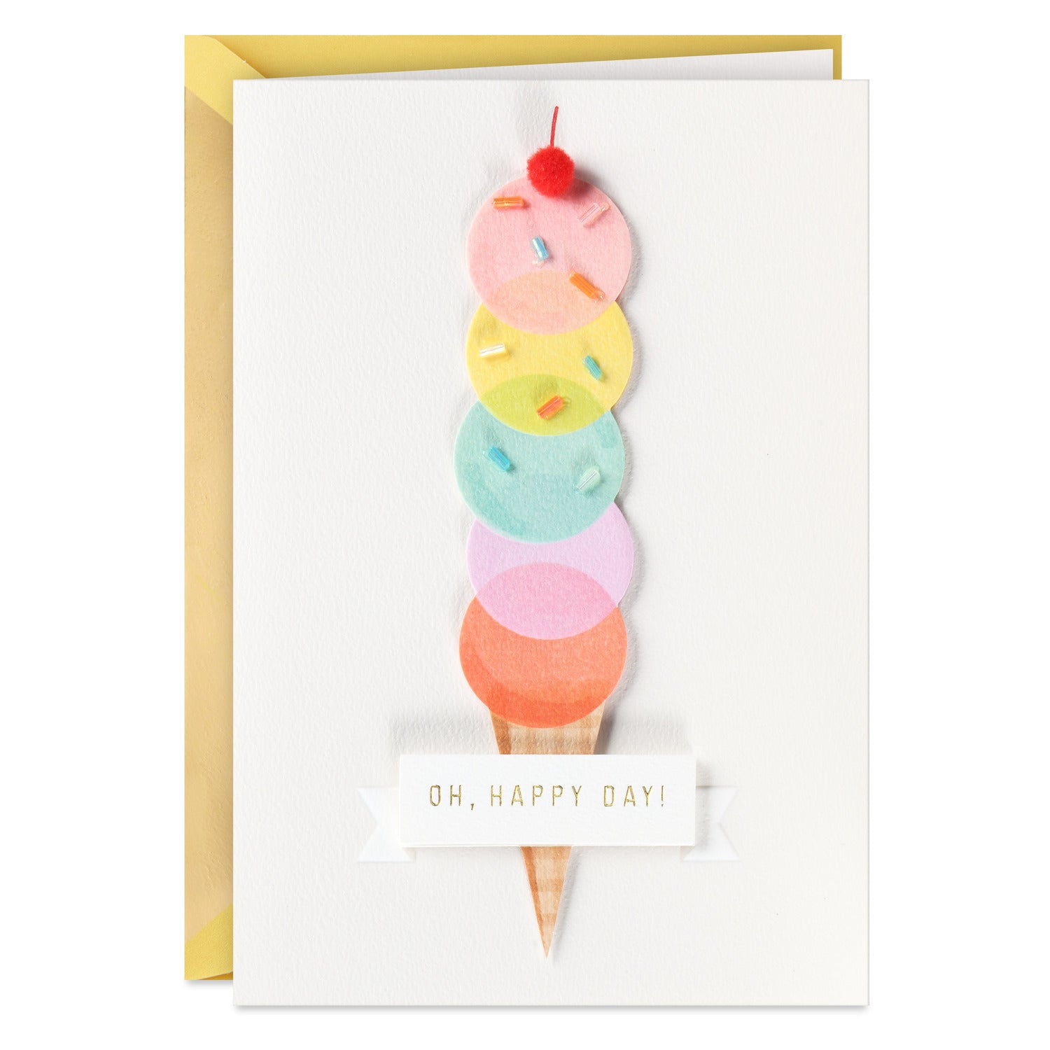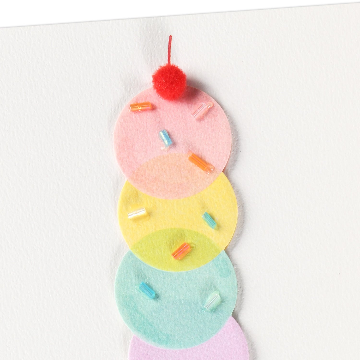 カラフルなアイスクリームの山、きらきら光るトッピング、そして頂点にチェリーが乗った、陽気な立体デザインが特徴のバースデーカードです。甘いメッセージとともに、ホイルとビーズのアクセント、3Dレーザーカットの装飾、ポンポンの縁取りが施されています。