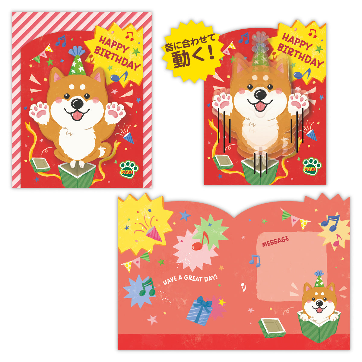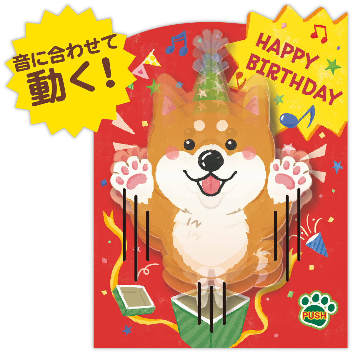 音楽に合わせて動くオルゴールカード! バースデーソングに合わせて犬が飛び跳ねながら誕生日をお祝いします。犬の鳴き声入り。