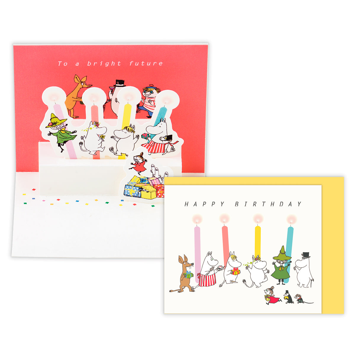 ちょっとしたメッセージを書いたりギフトに添えたりしやすい立体ミニカード。カードを開くと、カラフルなキャンドルや楽しそうなムーミンたちの姿がポップアップします。