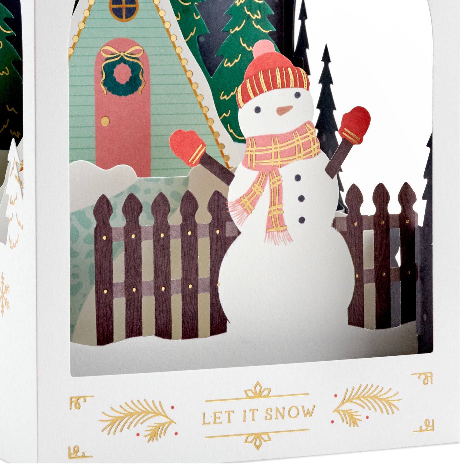 赤いミトン、ニット帽、ピンクのチェック柄マフラーを身につけたかわいい雪だるまが、雪に覆われたかわいらしい家と板塀の前に立つ、精巧な3Dジオラマが描かれています。