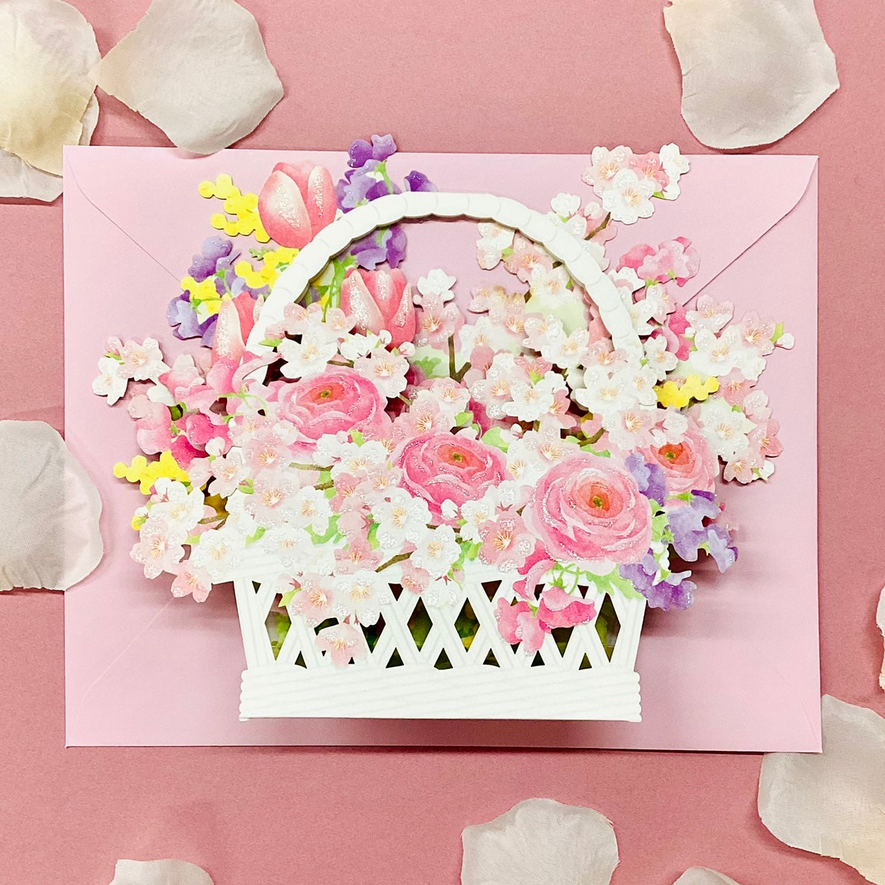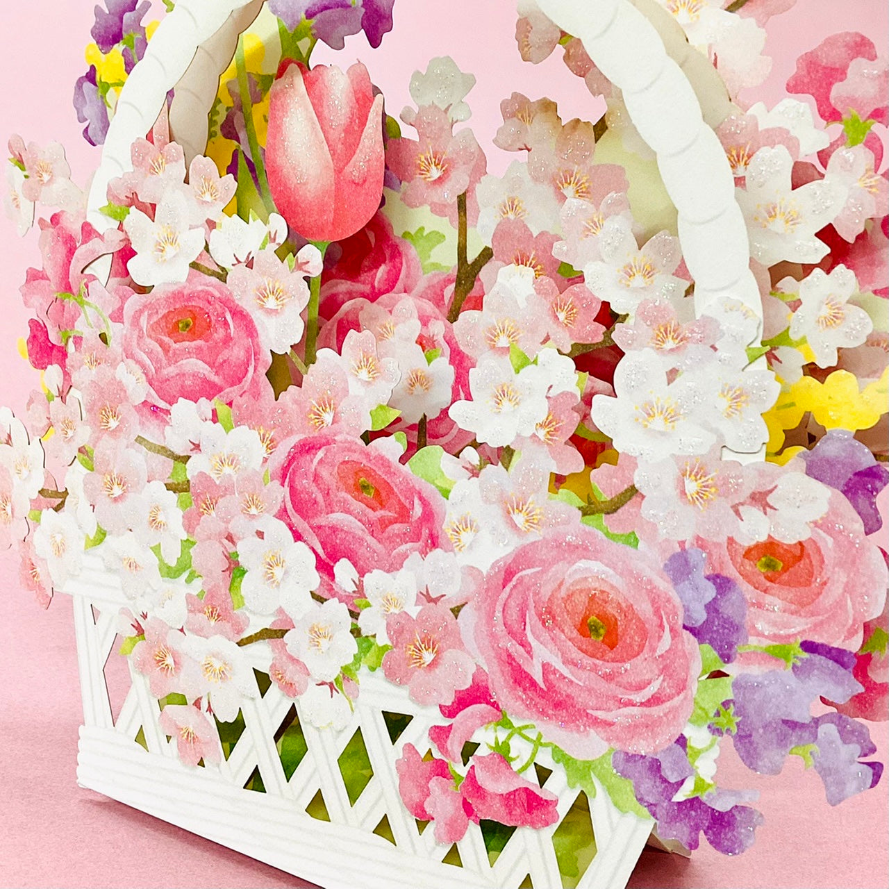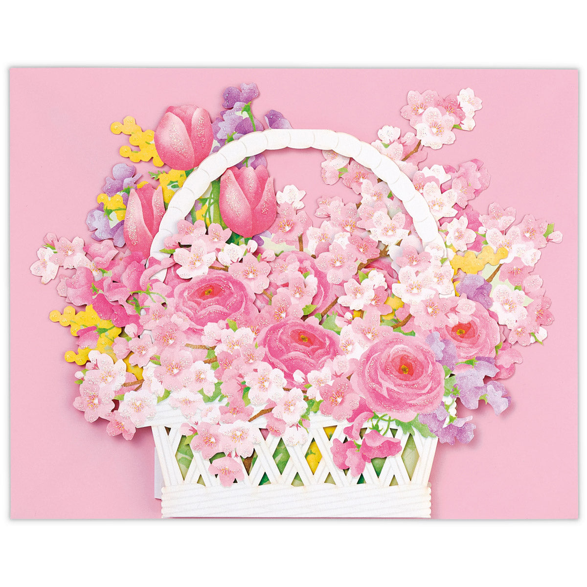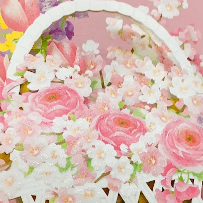 桜をはじめとする春の花がたっぷり入った花かごを立体カードで表現。インテリアとして飾ってもお楽しみいただけます。