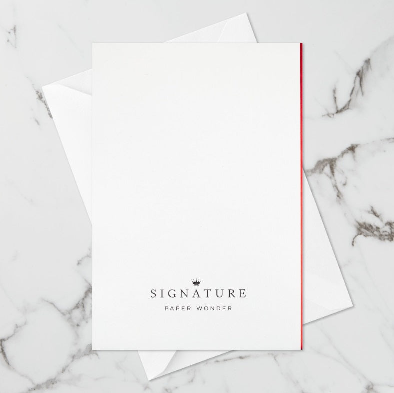 飾られたクリスマスツリーのイラストと「メリー・クリスマス」の願いが描かれた、Signatureのおしゃれな立体クリスマスカードです。カードを開くとホイルとダイカットのディテールに目を見張るはず。クリスマスツリーやオーナメント、「メリークリスマス」のメッセージが立体的に描かれています。