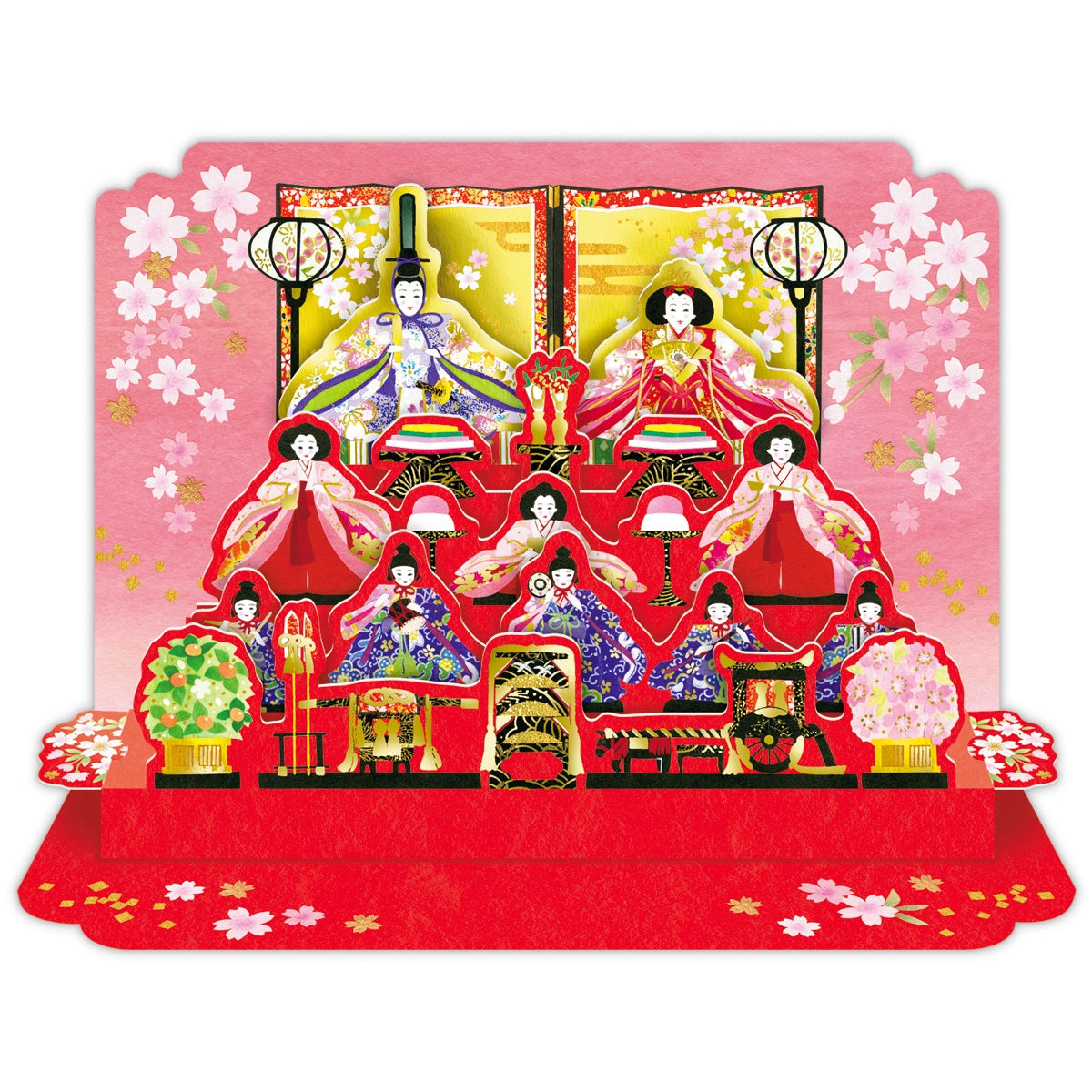 桃の節句のお祝いとして気軽に贈れる、十人飾りをイメージした豪華な立体カード。本物のひな人形のように立てて飾っておくことができます。