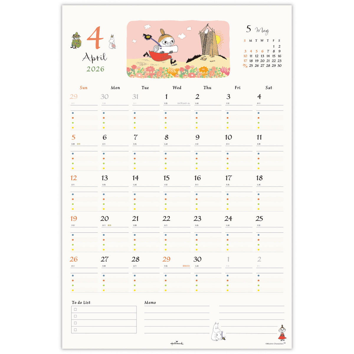 ●表紙・本文サイズ:455×304mm●表紙1枚 本文12枚●シール付き●ツインリング綴じ●12ヶ月絵柄情報シート 1枚●祝日表記:日本語/六曜・二十四節気付き