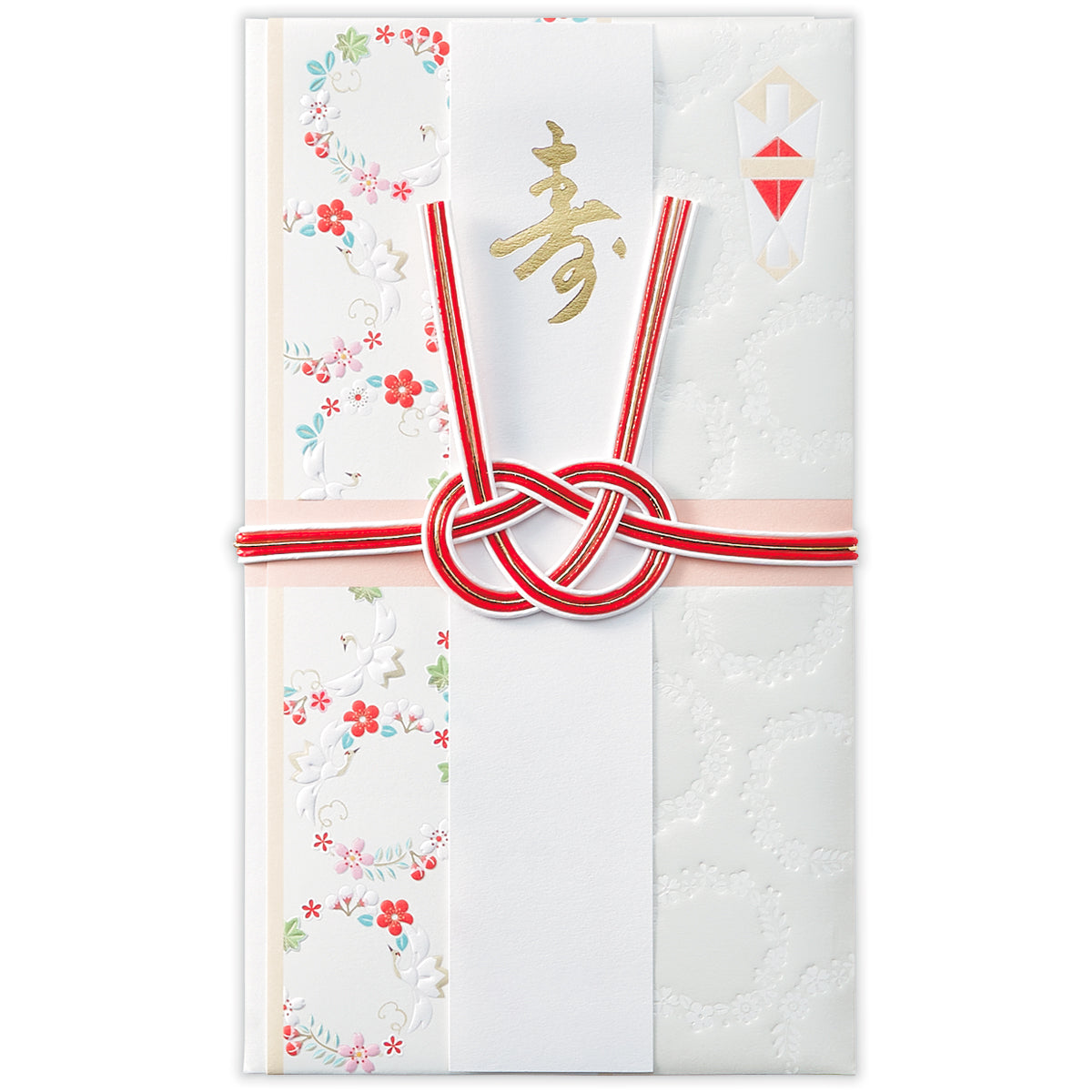 鶴や梅、松など幸せを象徴するモチーフが円になっている結婚お祝い用の祝儀袋です。結婚によってご縁がつながったり広がったりしていく様子をイメージしました。