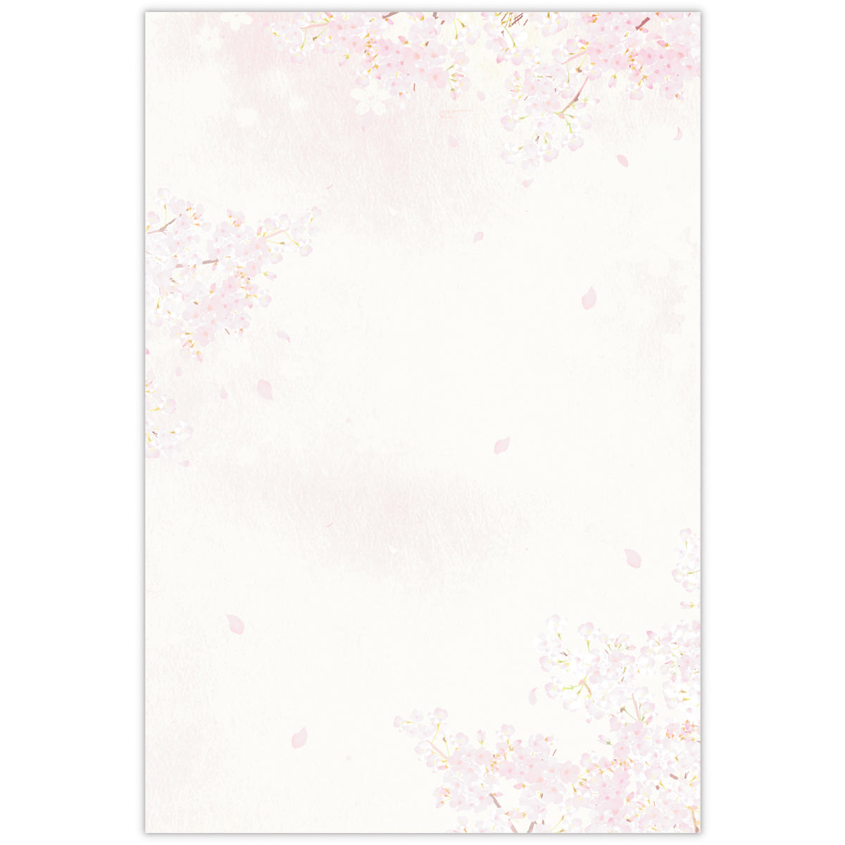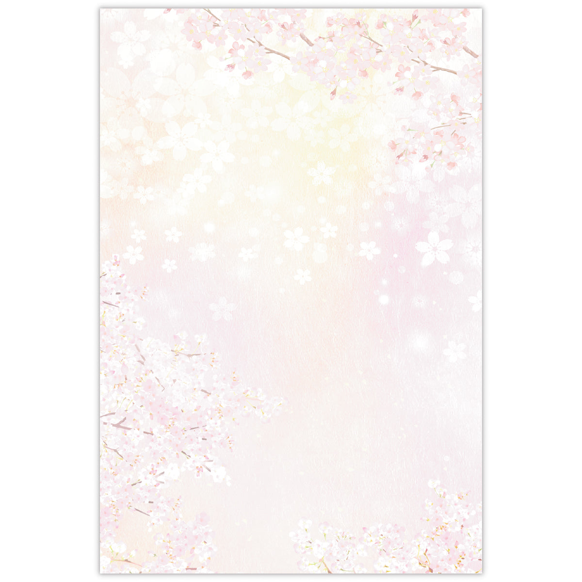桜並木の下から、枝いっぱいに広がる満開の桜を見上げているような心に残る情景を描きました。淡い色合いのグラデーションがまばゆい春の光を思い起こさせます。罫線なしタイプなので縦書き横書きどちらにもお使いいただけます。