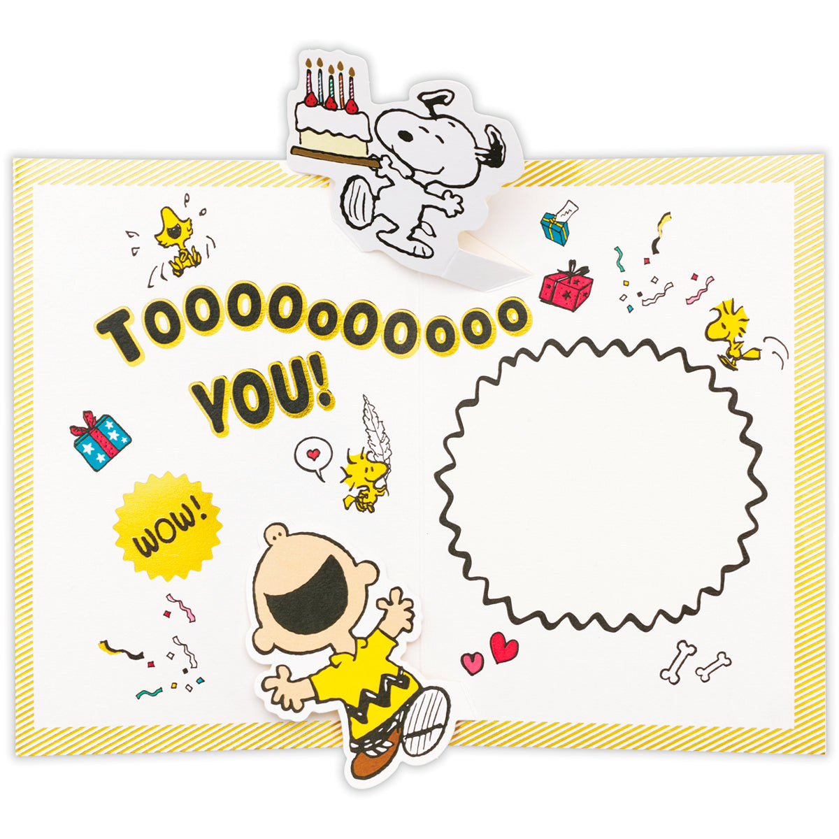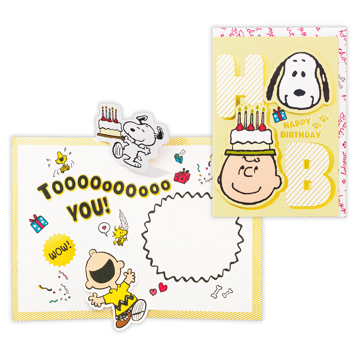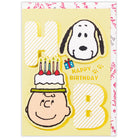 スヌーピーとチャーリー・ブラウンが大きくデザインされたバースデーカード。カードを開くと笑顔のスヌーピーとチャーリー・ブラウンやモチーフがダイナミックにポップアップ! 見ているだけでワクワク元気な気持ちになれるデザインです。