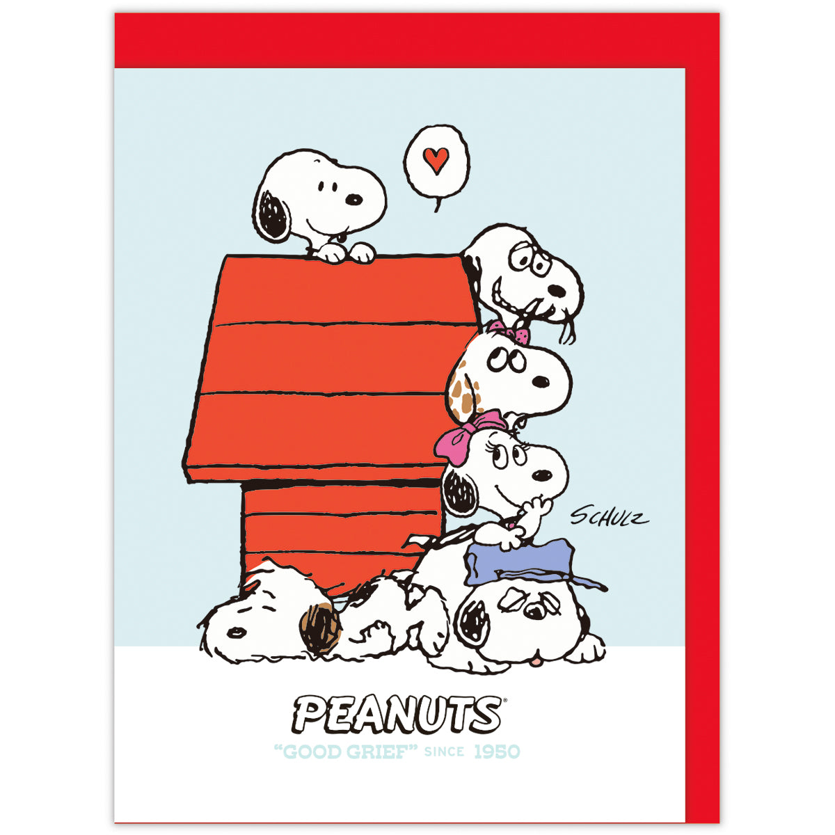PEANUTSの定番モチーフ・赤い犬小屋に、きょうだいたちがずらりと並んだキュートなカード。スヌーピーときょうだいたちが仲良く集まり、ひょっこり顔を覗かせる様子が可愛らしいデザインです。