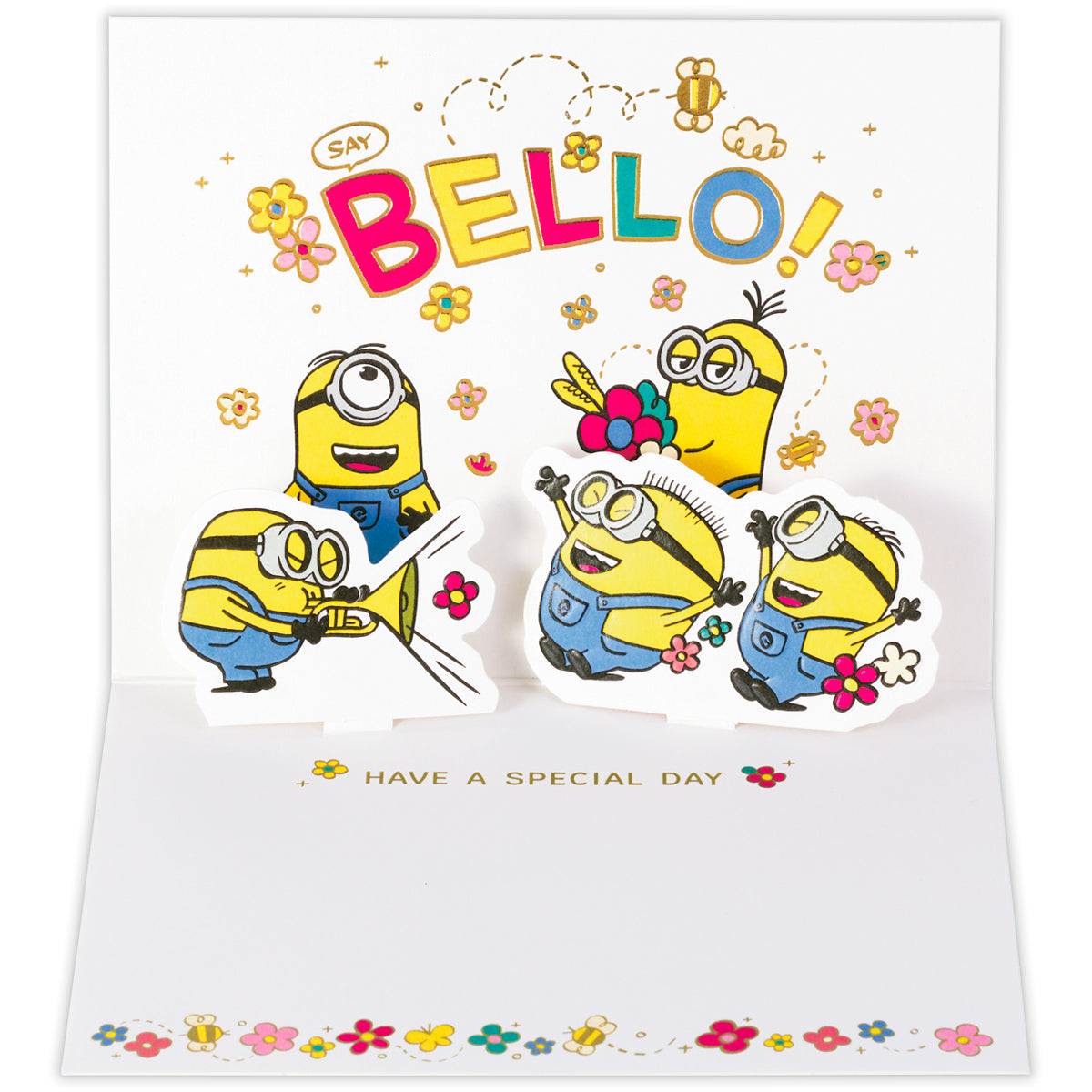 カラフルなお花のアートに囲まれたミニオンズが、楽しそうに笑顔を弾けさせるバースデーカード。大きくレイアウトされたミニオン語の挨拶「BELLO!」が、開いた瞬間に元気を届けます。見ているだけでハッピーになれる、遊び心いっぱいのデザインです。