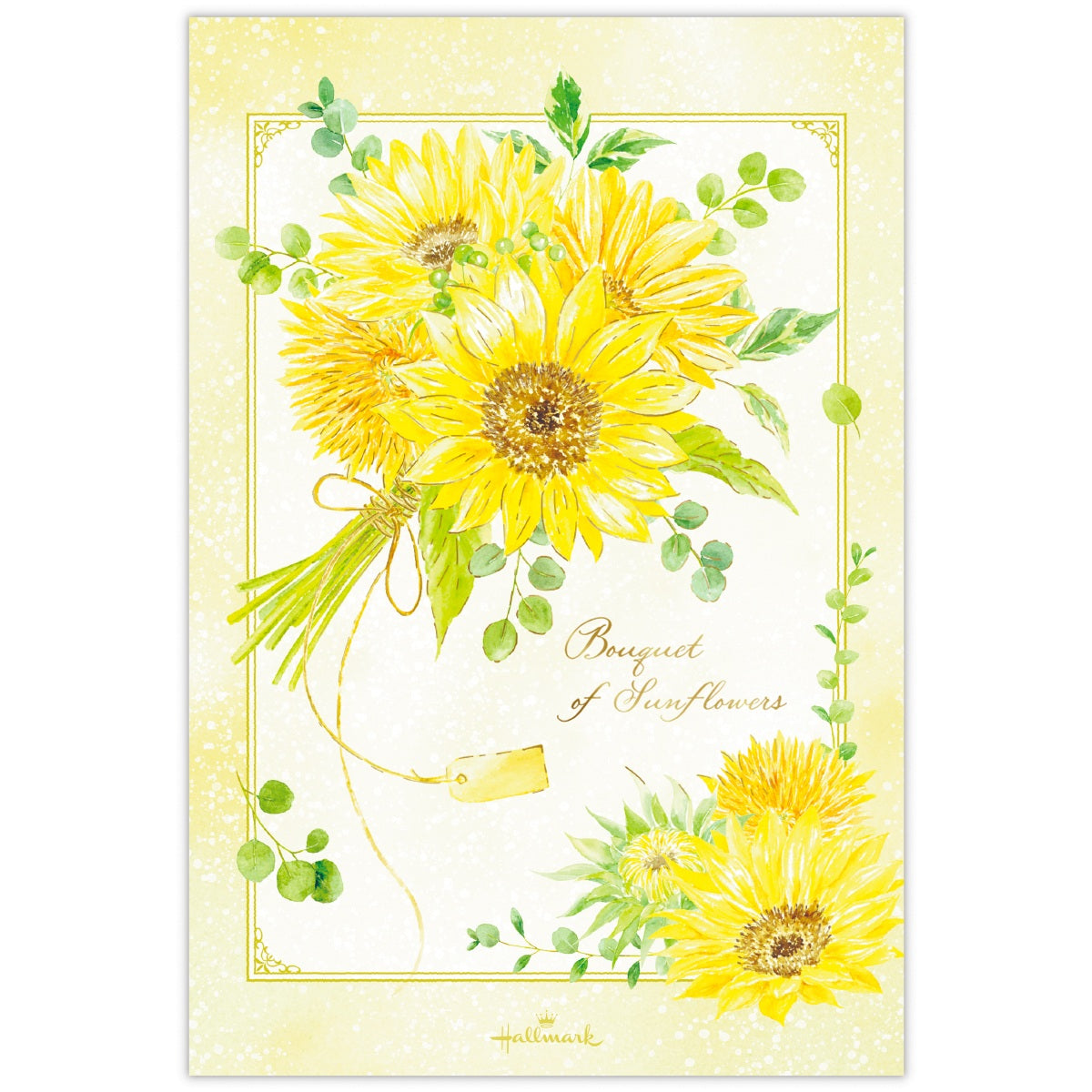 注目のミニひまわりのブーケを取り入れたデザイン。小ぶりながら元気いっぱいに咲くミニひまわりを、ナチュラルで優しいタッチで表現したハガキ箋。やわらかなベージュの背景に、鮮やかなイエローが美しく映えます。