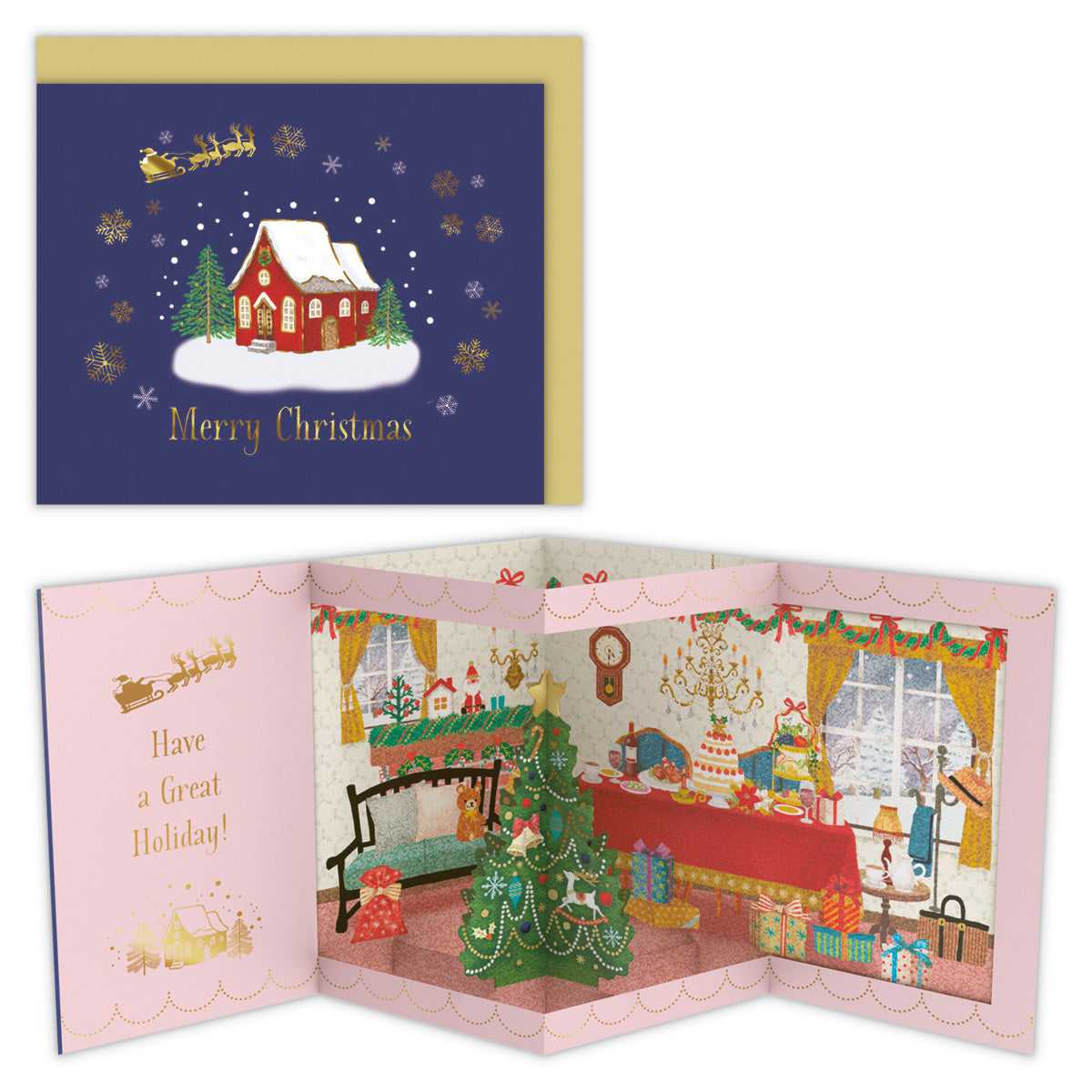 クリスマスのおうちの風景を切り取った心温まる立体カードです。ところどころにストーリーを感じさせるモチーフをちりばめました。細部までじっくりお楽しみいただけます。