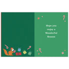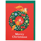 色使いやタッチ、さりげない加工に個性が光る海外デザインカード。クリスマスリースの周りで楽しそうに過ごすリスを描いた可愛らしいデザインです。