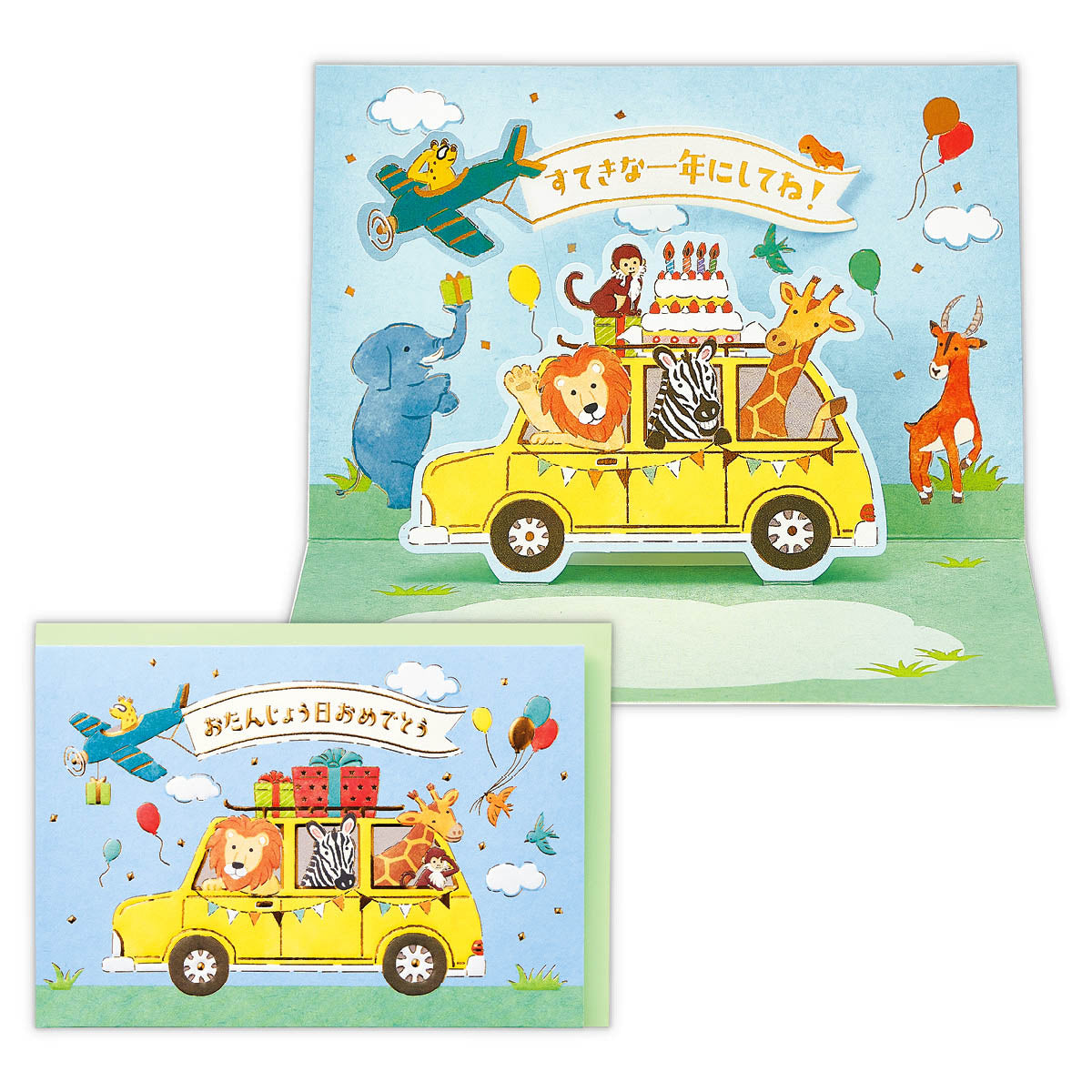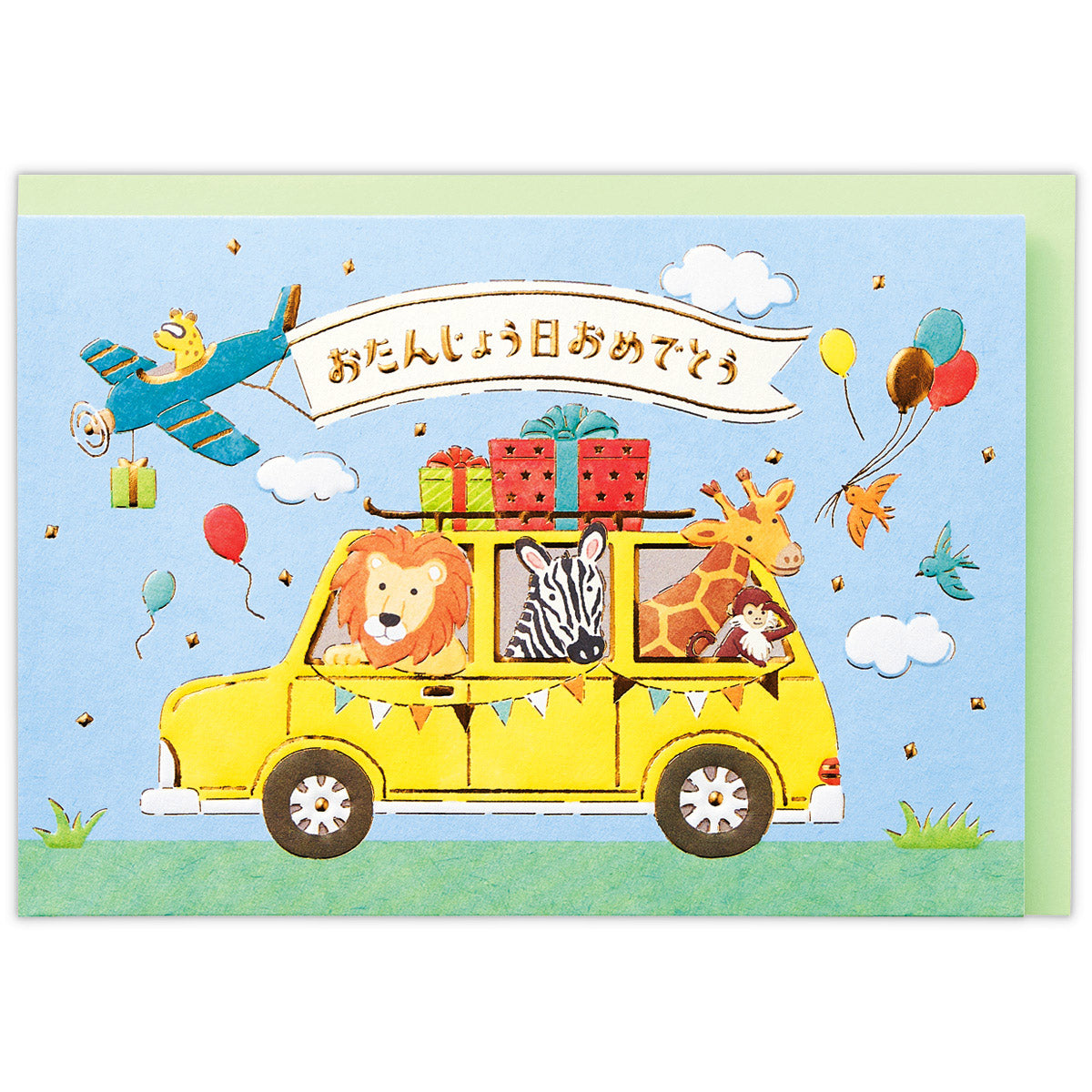 ライオン、シマウマ、キリンなどの動物たちと鮮やかな黄色い車が印象的なバースデーカードです。センチメントには小学校低学年で習う漢字を取り入れました。小学校に入学したお子さまへの誕生お祝いにぜひ!