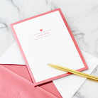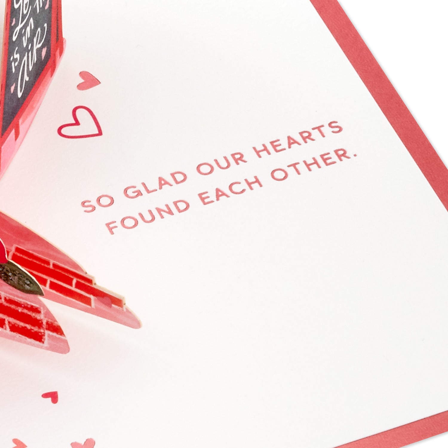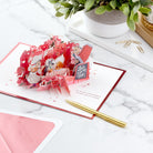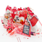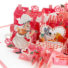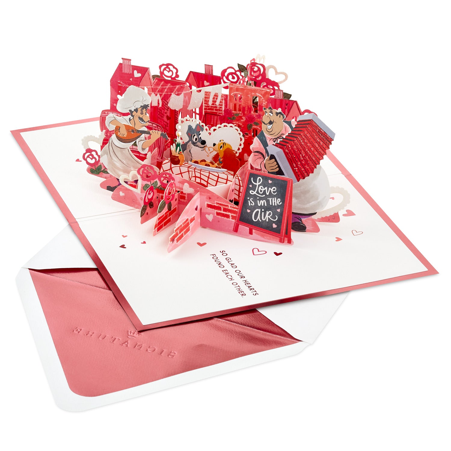 ハートのアイコンと「Love You」のメッセージ、そして光沢のあるピンクの箔の縁取りが特徴のポップアップグリーティングカード。中には、レーザーカットで精巧に作られた、ディズニー映画『わんわん物語』のスパゲティ・ディナーでのキスシーンが飛び出す仕掛けが施されています。