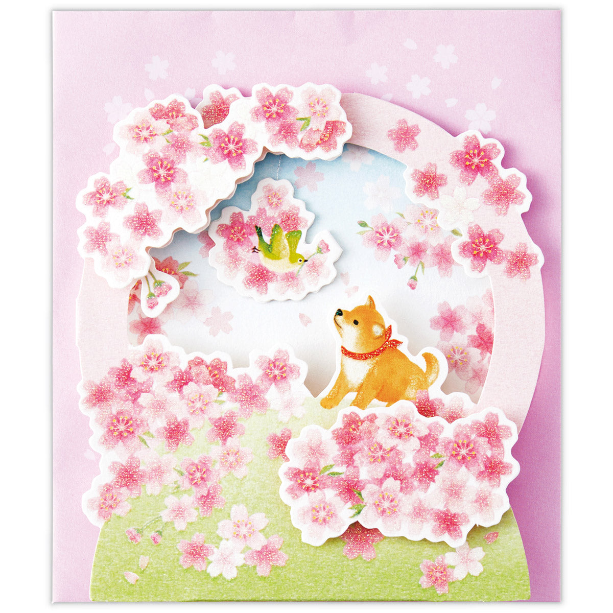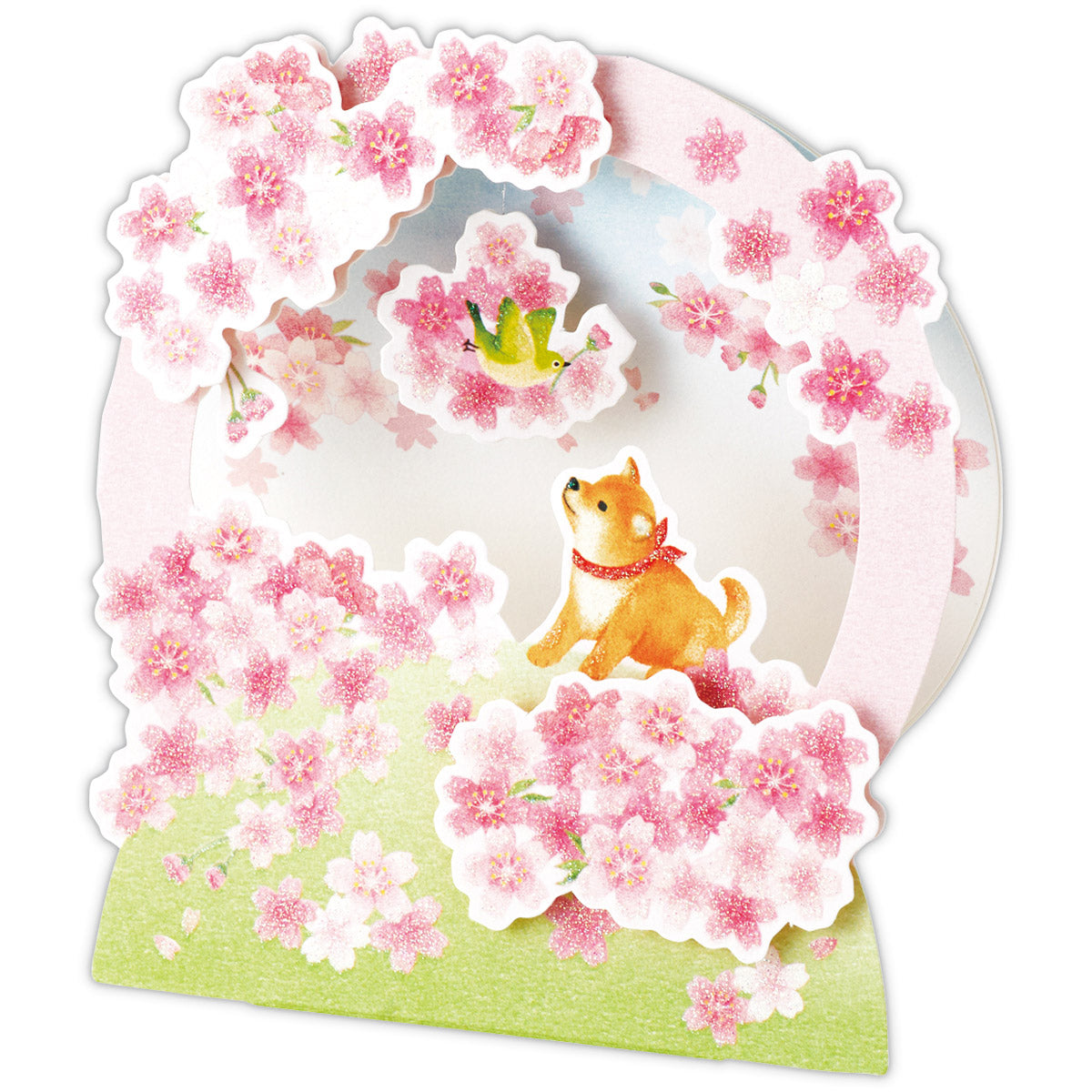 リース型の機構で幻想的な桜の風景を表現。メジロと柴犬が可愛らしいポイントです。立てて飾れるタイプなのでインテリアとしてもお楽しみいただけます。