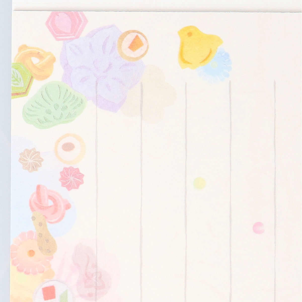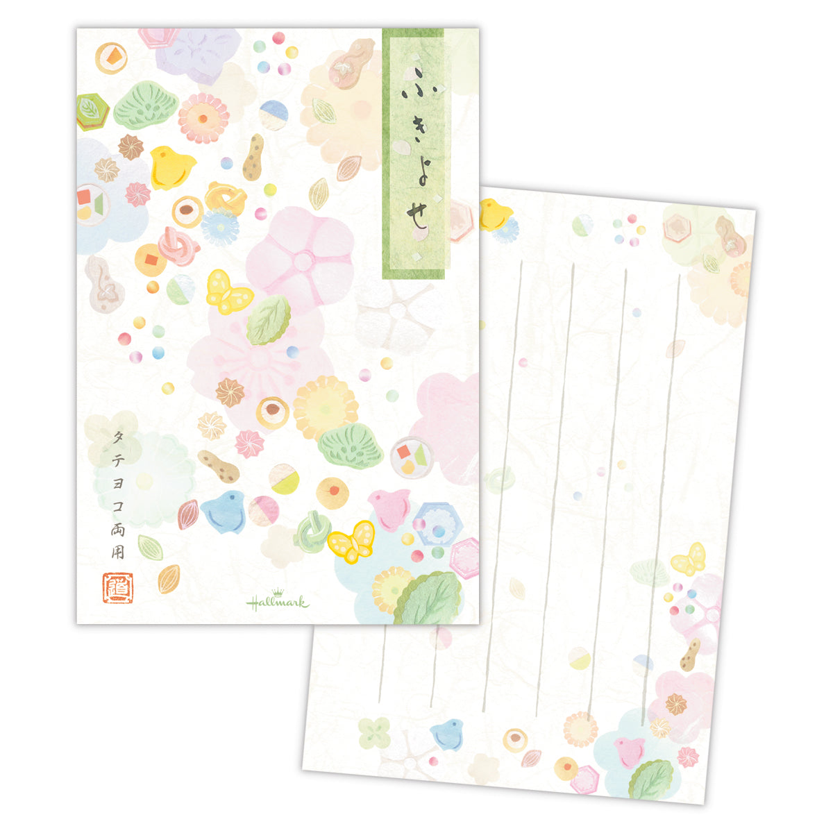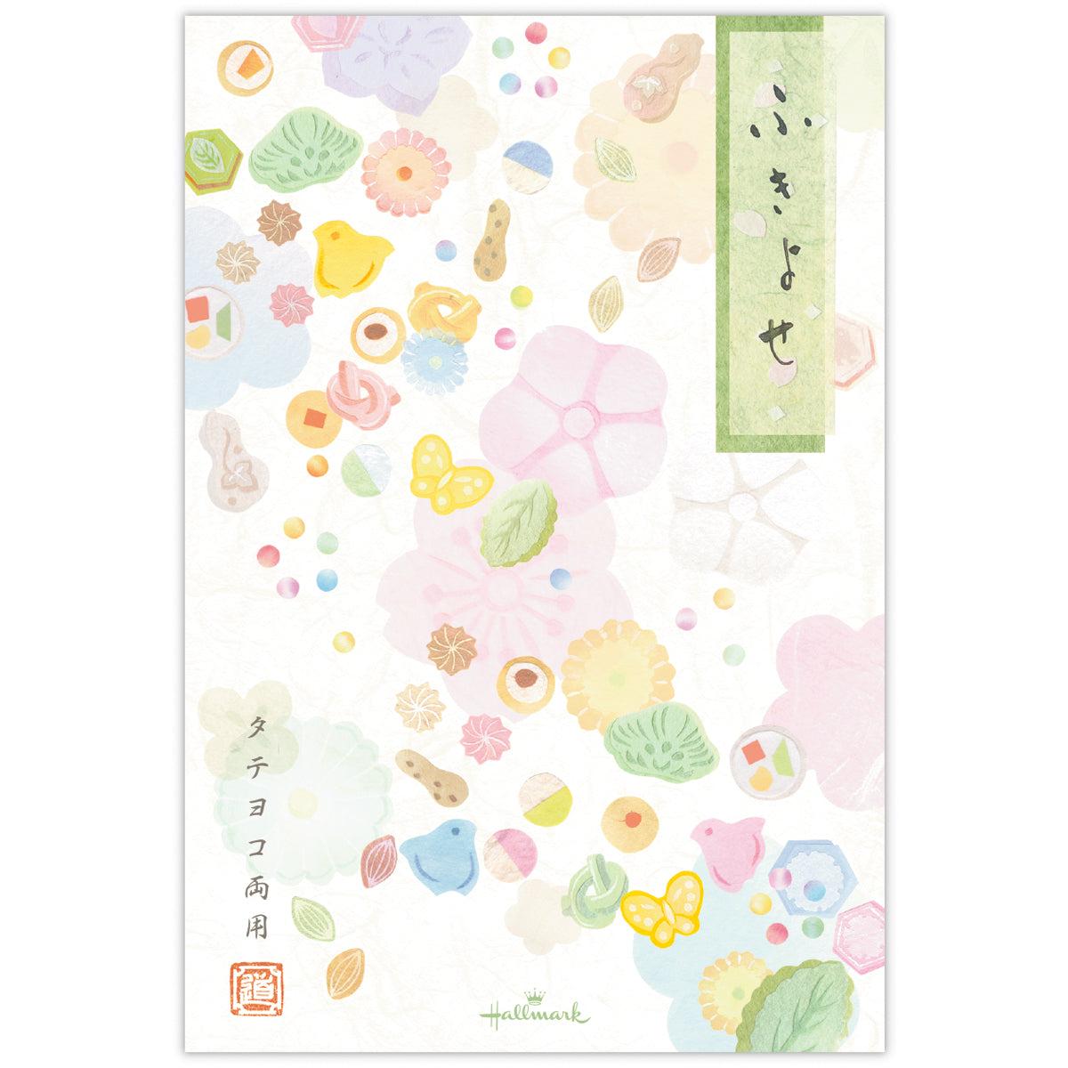 「風が運ぶ愛らしいものたち」の意味を持つ京都の伝統菓子「ふきよせ」がモチーフ。自社の和柄レターを多数手がけているコラージュ作家・おのみちこによる可愛らしい貼り絵がポイントです。