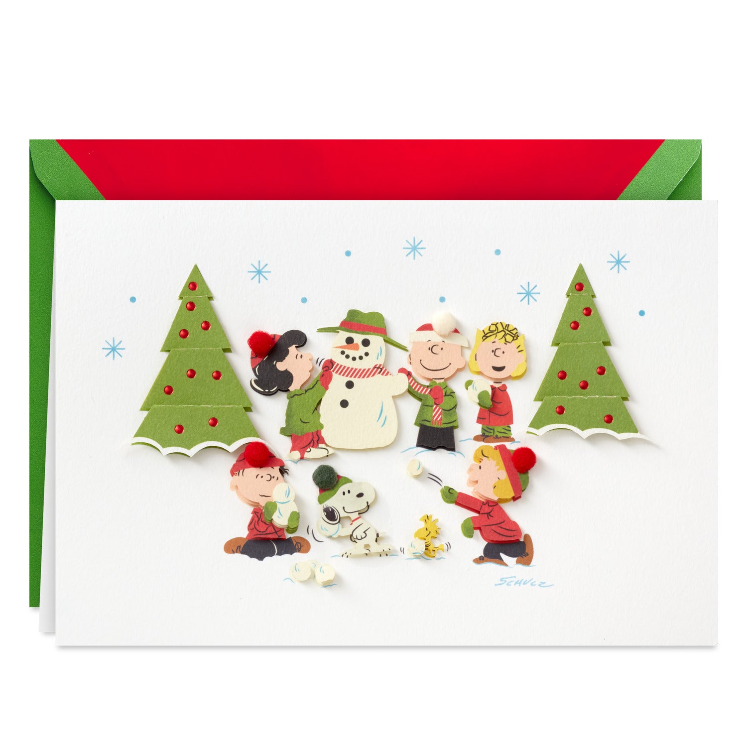 チャーリー・ブラウン、スヌーピー、そして仲間たちが雪の中で遊ぶ様子を3Dで表現した、ホールマークシグネチャーのクリスマスカードです。